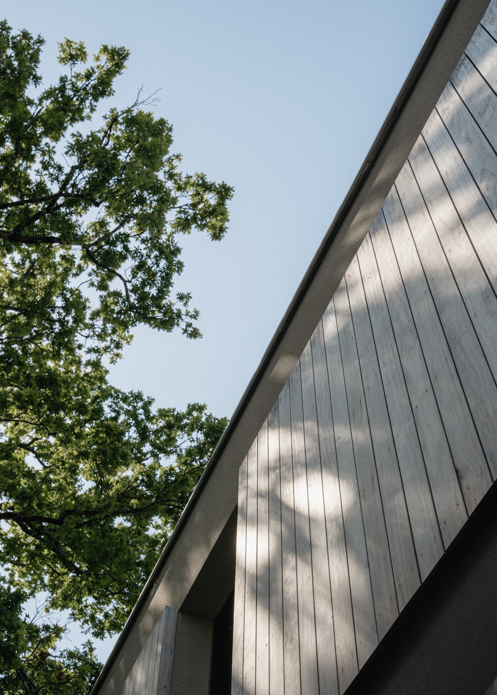 De techniek van dubbele modificatieTM zorgt ervoor dat het hout bestand is tegen alle weersomstandigheden en garandeert het een lange ontwerplevensduur met minimale onderhoudsvereisten. De Kebony Clear gevelbekleding zal geleidelijk een karakteristieke zilvergrijze patina krijgen, waardoor het samen met het gebouw evolueert en het huis na verloop van tijd harmonieus opgaat in de bosrijke omgeving.