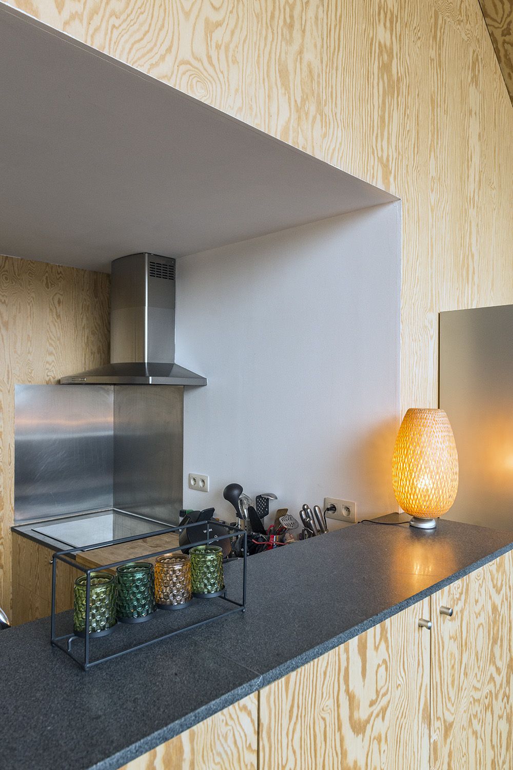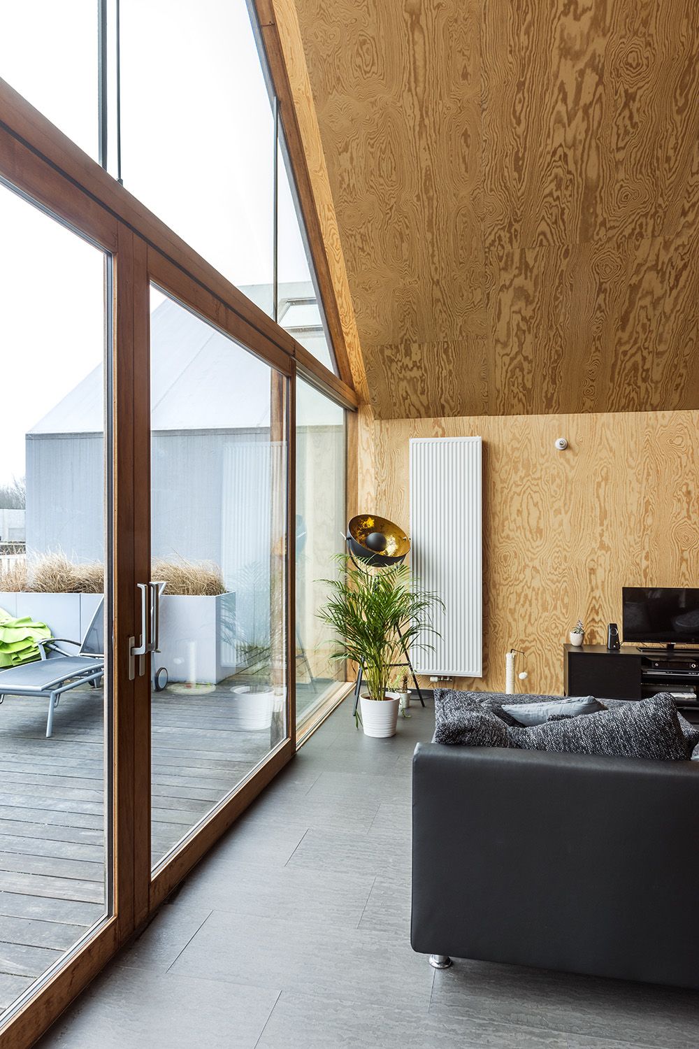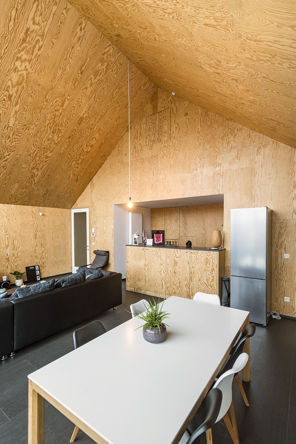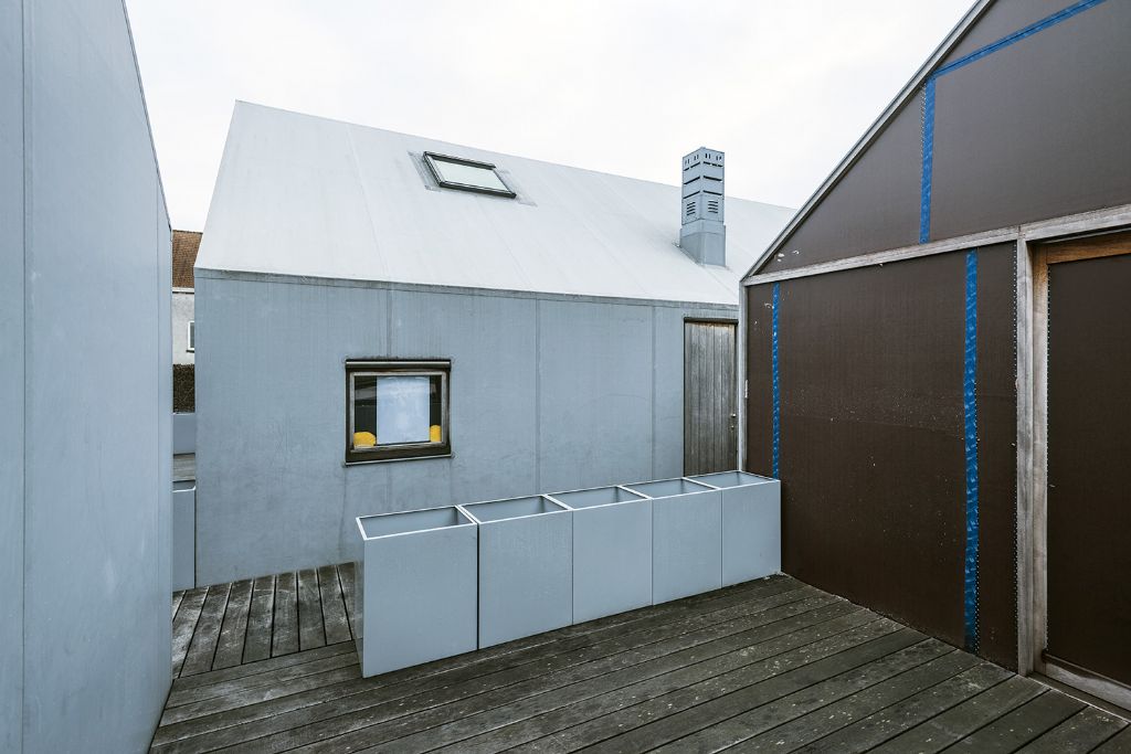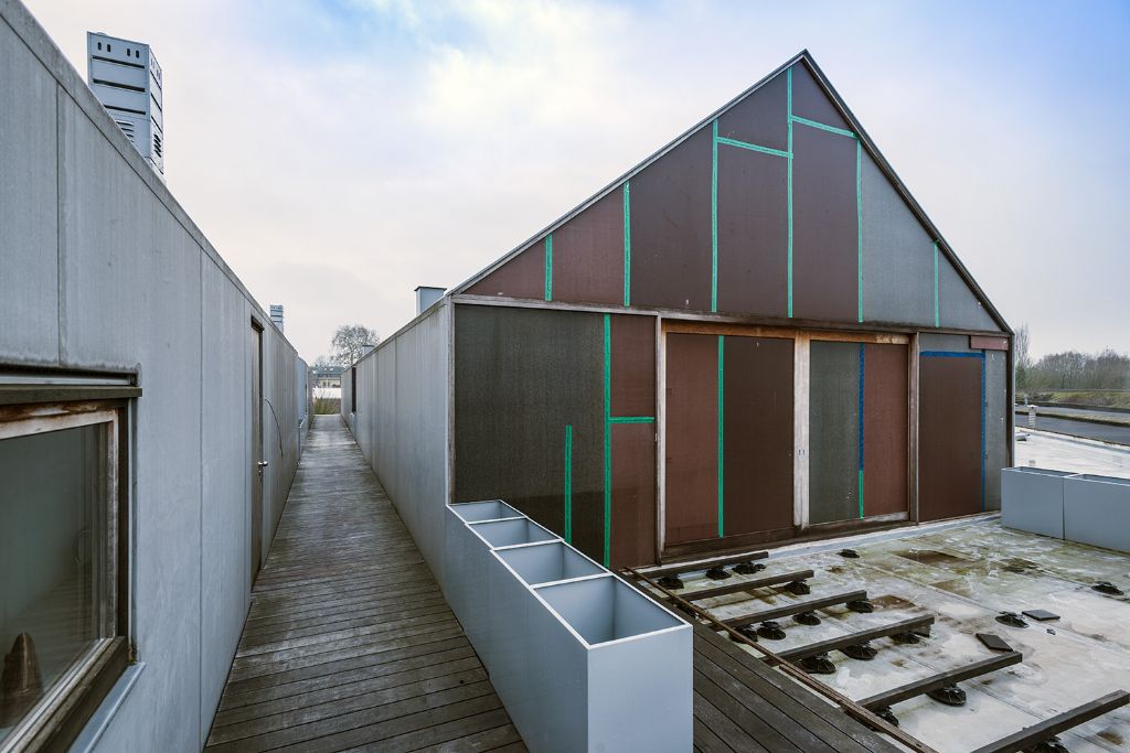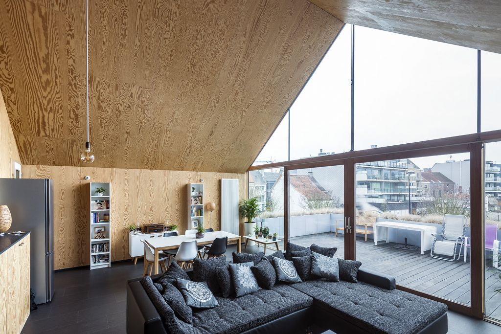 Op het dak vinden we vier woningen terug met een elk een oppervlakte van 115 vierkante meter en een ruim terras van 35 vierkante meter. Op deze manier sluiten wonen en werken perfect op elkaar aan. Overdag vindt er bedrijvigheid plaats in de loods als de bewoners werken zijn. ’s Avonds en tijdens de weekends genieten de bewoners van een prachtig zicht en een ruim terras op een boogscheut van het centrum. De archetypische huisvorm vloeide voort uit de voorschriften. Seger Delmulle: “De kroonlijsthoogte ligt vast op 7 meter hoogte, de nokhoogte mag 10 meter hoog zijn. Doordat de loods op vraag van de bouwheer minimaal 4 meter hoog moest zijn, bleek de typische woningvorm met hellend dak de ideale oplossing.”