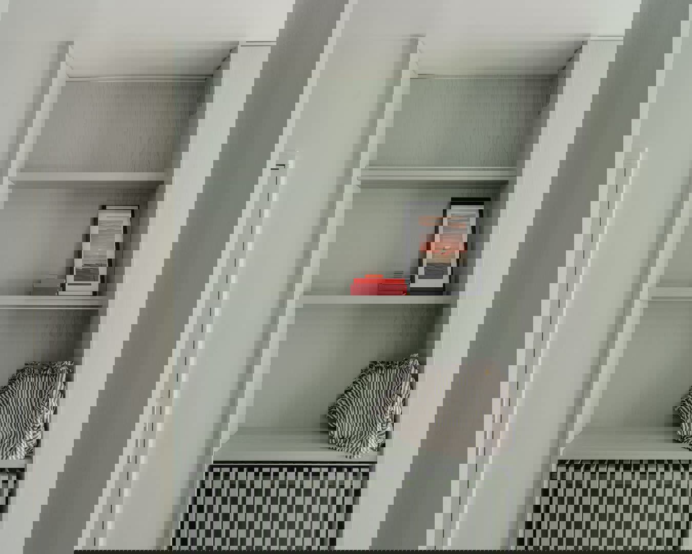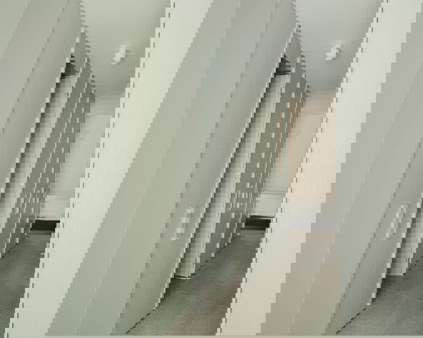 Een opvallend en speels aspect van het ontwerp is de manier waarop de circulatiezones in de kastwanden zijn geïntegreerd. De lange kaststructuur vormt niet alleen een visuele as, maar verbergt ook een ‘geheime’ doorgang naar een nachthal die leidt naar de badkamer, extra opbergruimte en een compacte tweede slaapkamer. Die laatste is uitgerust met drievoudig gestapelde bedden — een slimme en efficiënte oplossing die herinnert aan scheepsinterieurs en logeerplekken voor kinderen.