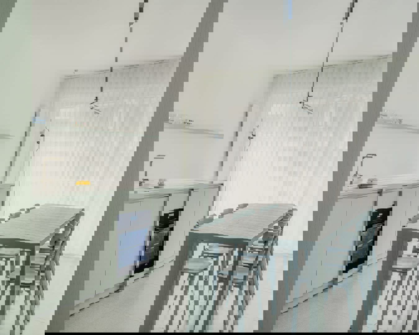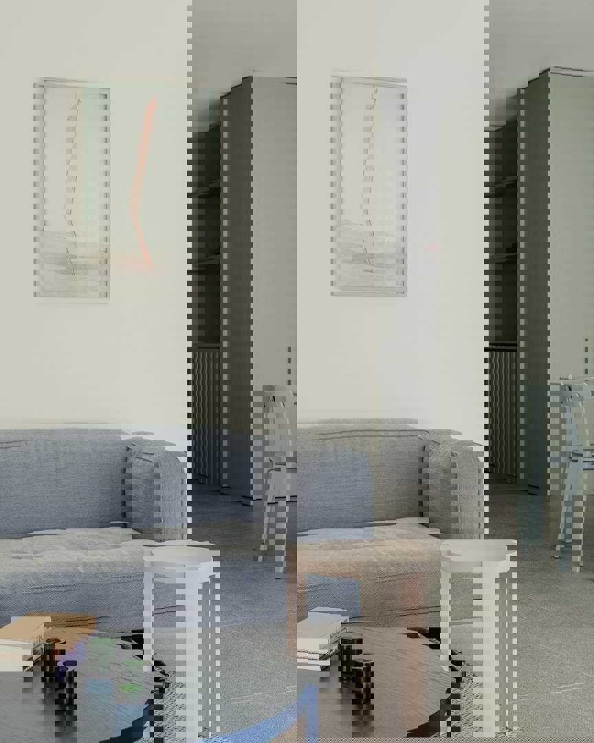 Midden in de flat staat een lange, lichtblauwe tafel – een ontwerp van Studio Jan Vermeulen en Atelier Ternier – die dienstdoet als eetplek, werkplek en ontmoetingspunt. Rondom de tafel is ruimte voor acht tot tien personen, perfect voor zomerse apero’s of winterse diners. De kleur sluit naadloos aan bij het zachte kleurenpalet van de kust, terwijl de vormgeving rust en openheid uitstraalt. De tafel vormt het kloppend hart van het appartement, letterlijk en figuurlijk.