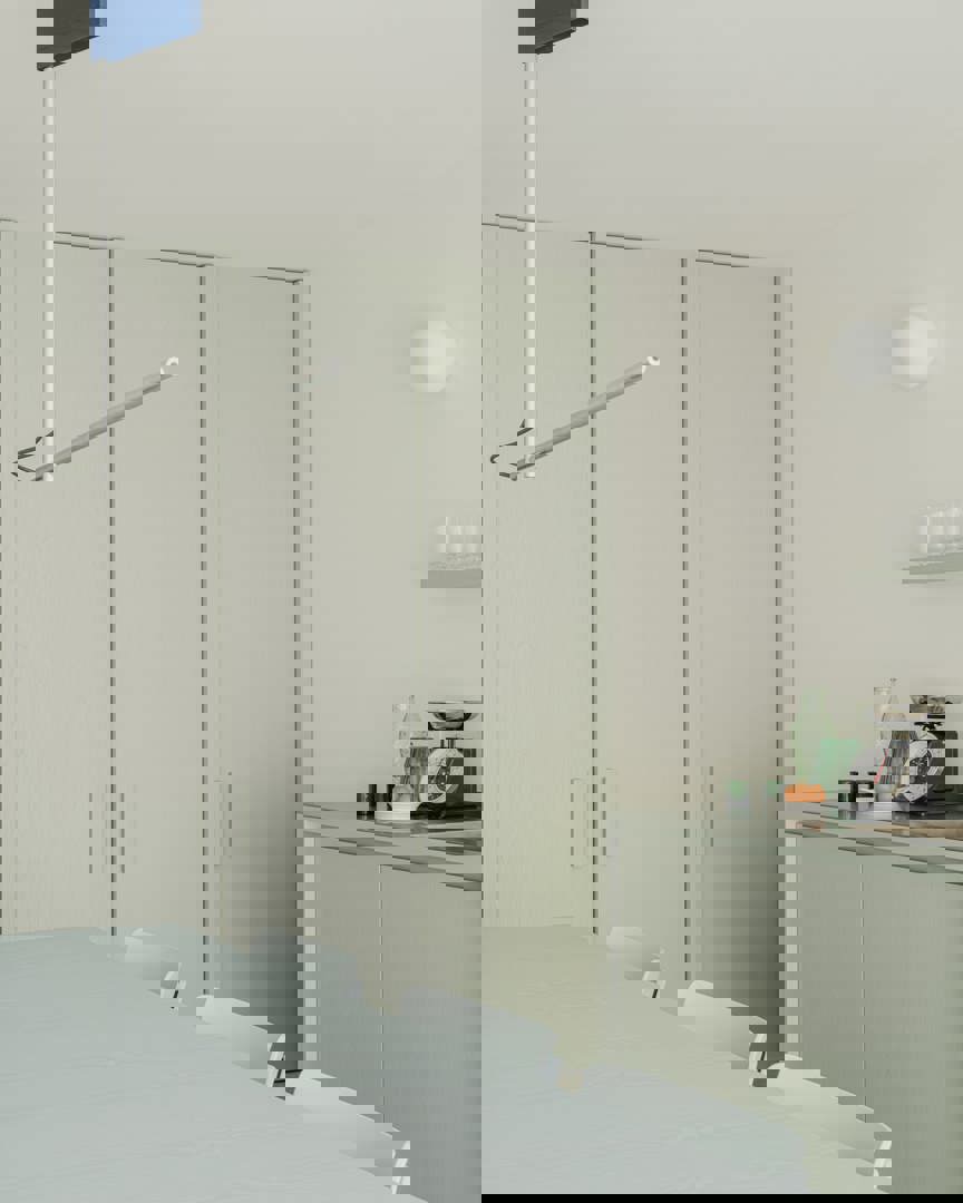 Via een grote pivotdeur kan de hoofdslaapkamer worden afgesloten of juist verbonden met de leefruimte. Zo ontstaat een flexibele plattegrond die zich aanpast aan de behoefte van het moment: open en loftachtig bij samenzijn, meer afgeschermd bij nood aan privacy. Door gangen te vermijden en functies te integreren in meubels, blijft elke vierkante meter optimaal benut — zonder in te boeten op rust of ruimtelijkheid.
