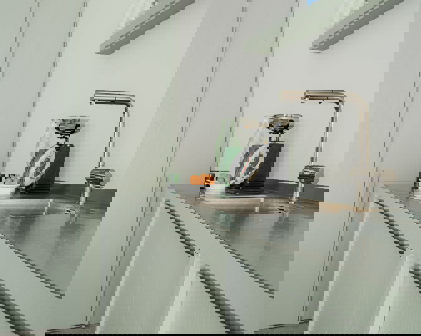 Het ontwerp is opgebouwd rond eenvoud en materialiteit. Plafondhoge kasten in zachtgroen gebeitst esfineer vormen de organiserende ruggengraat van de woning. Ze creëren bergruimte én structureren de plattegrond, van inkomhal tot hoofdslaapkamer. Tegelijk zorgen keuken- en badkamermeubels in roestvrij staal voor subtiele lichtreflecties, waardoor het interieur voortdurend verandert met het daglicht. Grote tegels, ruw van textuur en in een 1/3-patroon gelegd, verwijzen naar kuststenen golfbrekers en verbinden de verschillende ruimtes in een vloeiend geheel.