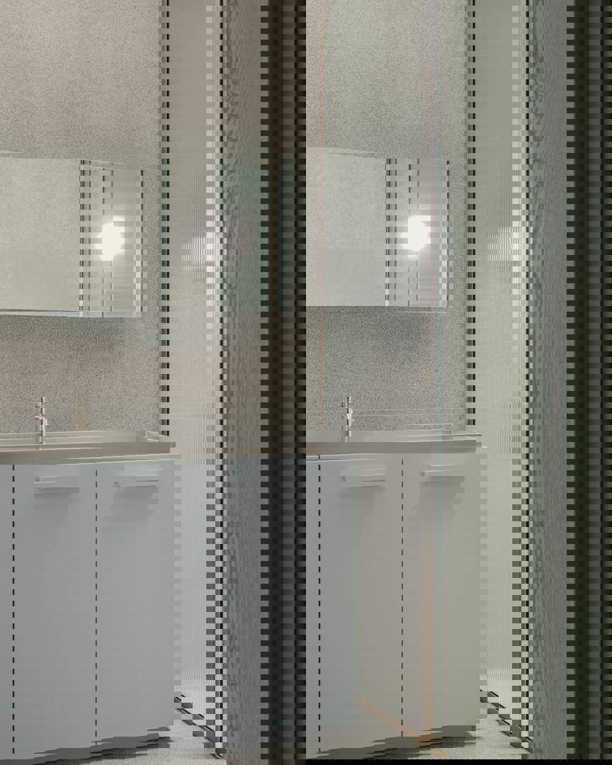 Ook in de badkamer worden deze materialen doorgetrokken: vloer en wanden zijn bekleed met dezelfde robuuste tegel, wat een intieme, grotachtige sfeer oproept. De royale douchezone is afgebakend met profielglas in een roestvrij stalen kader, waar bewoners letterlijk het strand van zich af kunnen spoelen. De verlichting werd bewust op de wanden geplaatst en straalt naar boven, waardoor het plafond optisch hoger lijkt en de ruimte meer adem krijgt. Zo ontstaat een helder en licht geheel, zonder visueel gewicht.