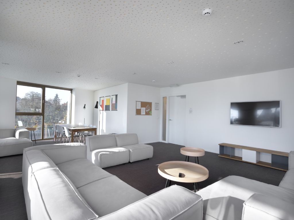 De belangrijkste gemeenschappelijke elementen van de residentie – de keukens – bevinden zich op de kop van het volume. Daar hebben de studenten de meest ruime zichten en konden de ontwerpers ook op een grotere schaal werken. “Voor de kamers zelf zijn we verder gegaan dan wat de stad ons oplegde. Ze zijn groter dan de verplichte minima en hebben elk hun eigen sanitaire ruimte. Een aantal kamers heeft ook een inpandig terras”, zegt de ontwerper. “Het afwerkingsniveau is duidelijk hoger dan de gemiddelde studentenkamer, met maatwerk dat is afgestemd op het ontwerp.”