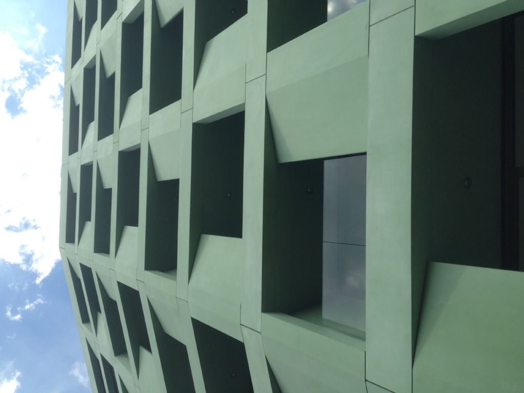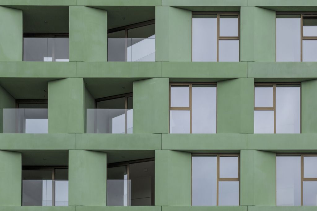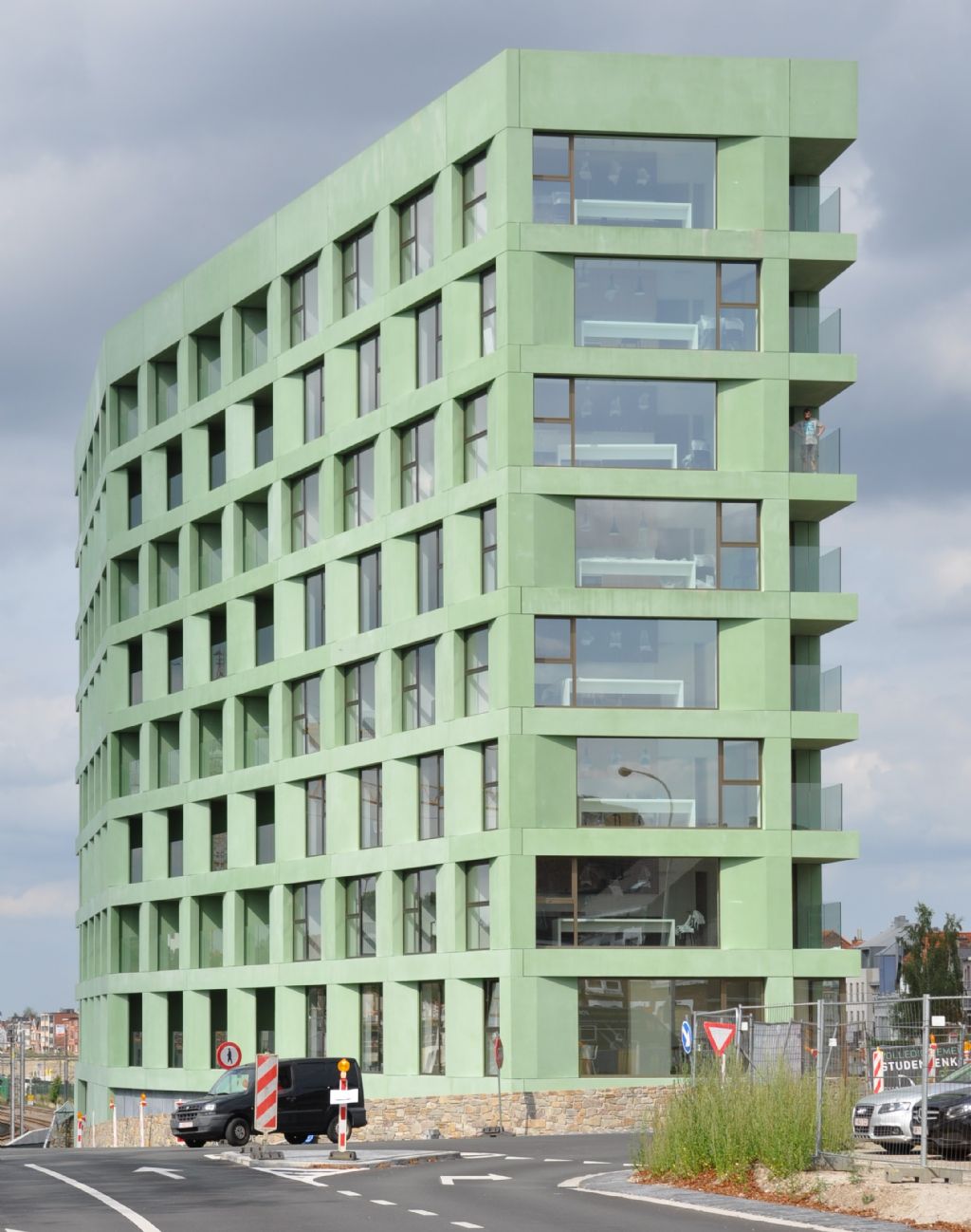De krachtlijnen van het grondplan komen ook terug in de geveluitwerking. De afgeschuinde penanten volgen de rasters van de studentenkamers. Om het repetitieve karakter van acht verdiepingen studentenkamers te vermijden en variatie te brengen, koos CBA ervoor om ze alternerend links en rechts te plaatsen. Alle zichtbare gevelelementen zijn in groen gezuurd beton uitgevoerd, van panelen over dorpels tot druiplijsten. CBA won er in 2017 een FEBE Elements Award mee.
