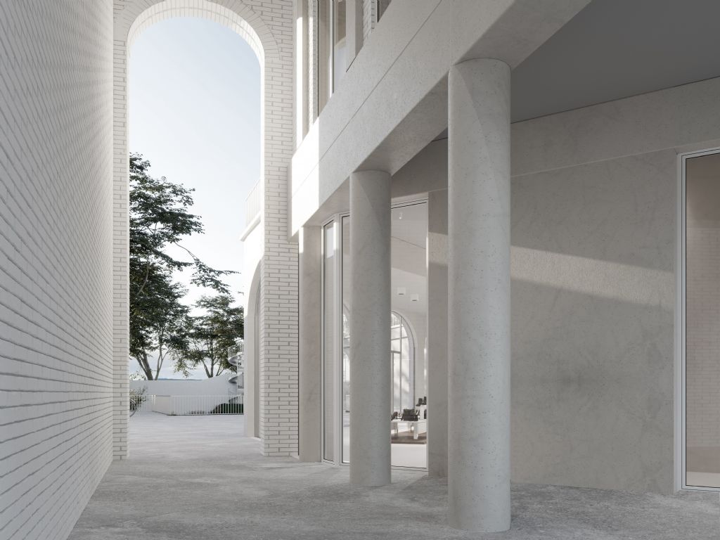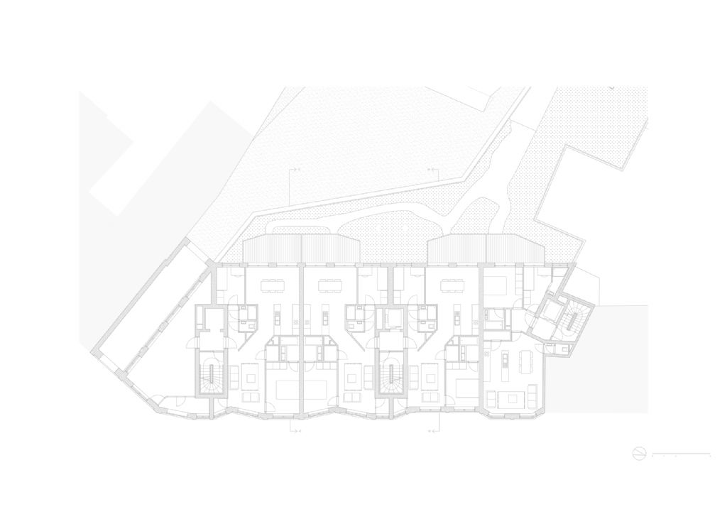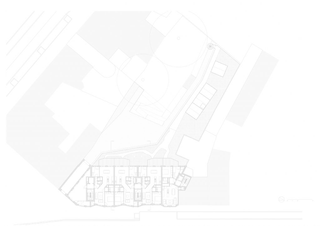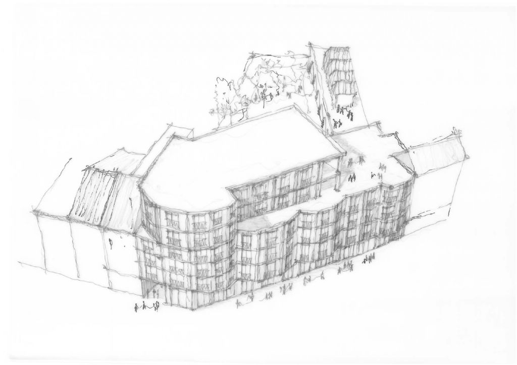 Het ontwerp markeert de hoek van de straat door een volumetrisch accent aan het plein. Aan de hand van de erkers in de voorgevel wordt geanticipeerd op de korrel en schaal van de omgeving. In het binnengebied wordt een zijde van de collectieve tuin bebouwd en voorzien van serres voor stadslandbouw. Op deze manier vertrapt het volume gradueel aan de hand van groene ruimtes.