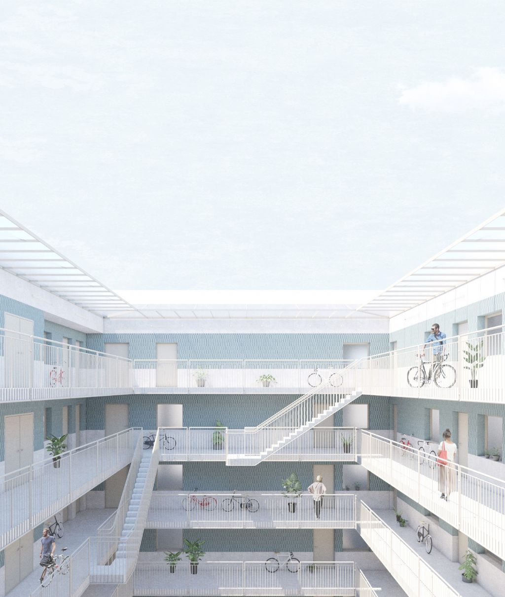 “De locatie van Dockside is niet vanzelfsprekend omdat ze een antwoord moet bieden op meerdere schaalniveaus: enerzijds vullen we een plek langs het kanaal in, langs een van de drukste kruispunten van Brussel, aan de Leopold II-laan en het Saincteletteplein. Daar werd terecht gevraagd om een antwoord te bieden op schaal van die ruimte”, vult Bram Aerts verder aan. “Anderzijds bouwen we op de schaal van het wonen; een heel kwetsbare activiteit die we op een erg drukke plek in Brussel laten landen. Vandaar hebben we een hele interieurwereld gecreëerd die rust brengt in het bouwblok, op een van de drukste kruispunten van het land.”