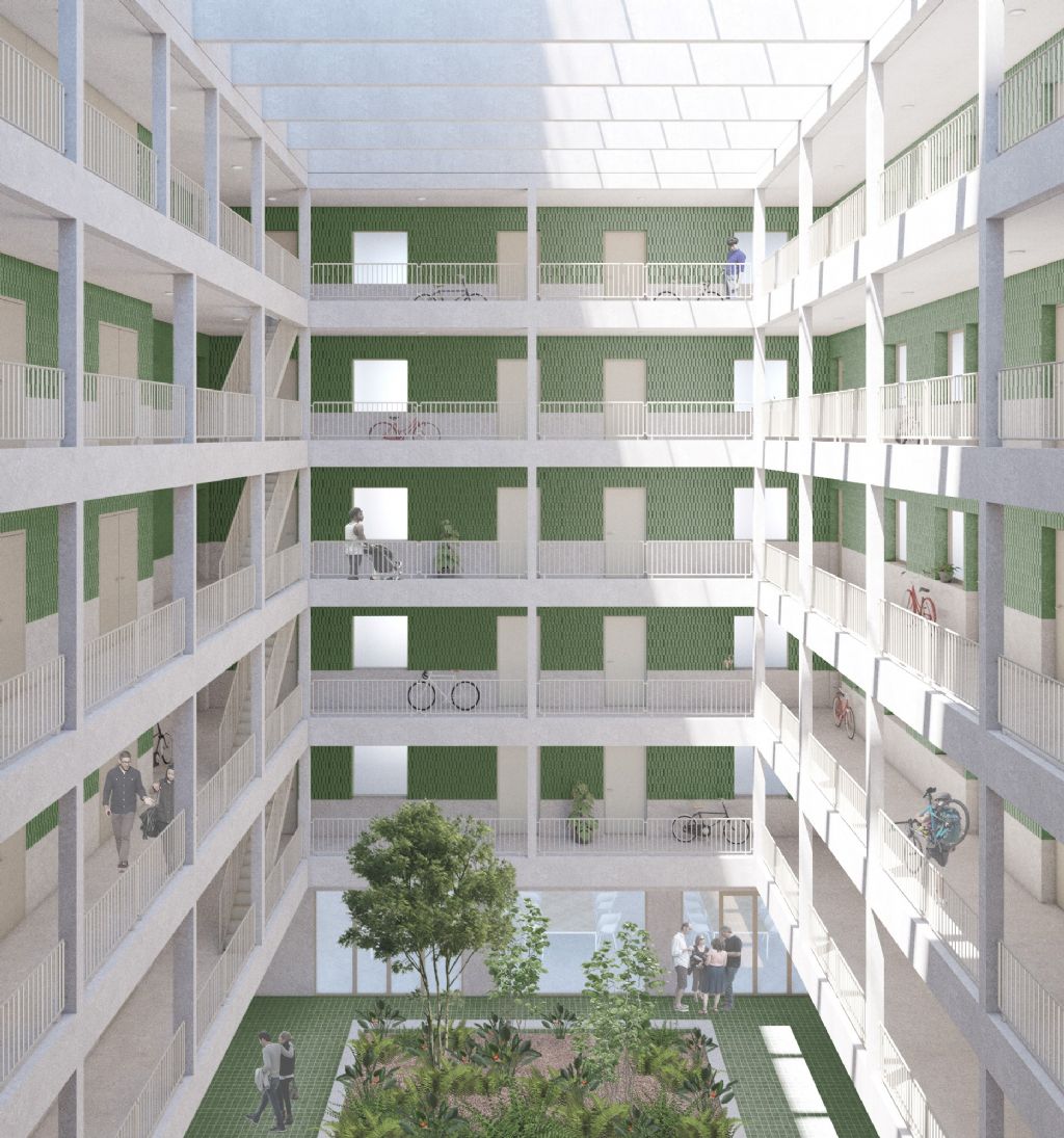 Boven het retailgedeelte is op de eerste verdieping een grote collectieve ruimte ingericht. Die kan gebruikt worden door de bewoners voor feesten of bijeenkomsten, en door externen zoals de bedrijven die gevestigd zijn in de kantoren in het gebouw. Daarboven is de woonfunctie vormgegeven. De wooneenheden zijn ingericht rond een groot atrium dat meerdere bouwlagen omvat. Bewoners kunnen tevens terecht in de gedeelde bibliotheek en de dakboerderij die uitzichten biedt over Brussel in alle windrichtingen.