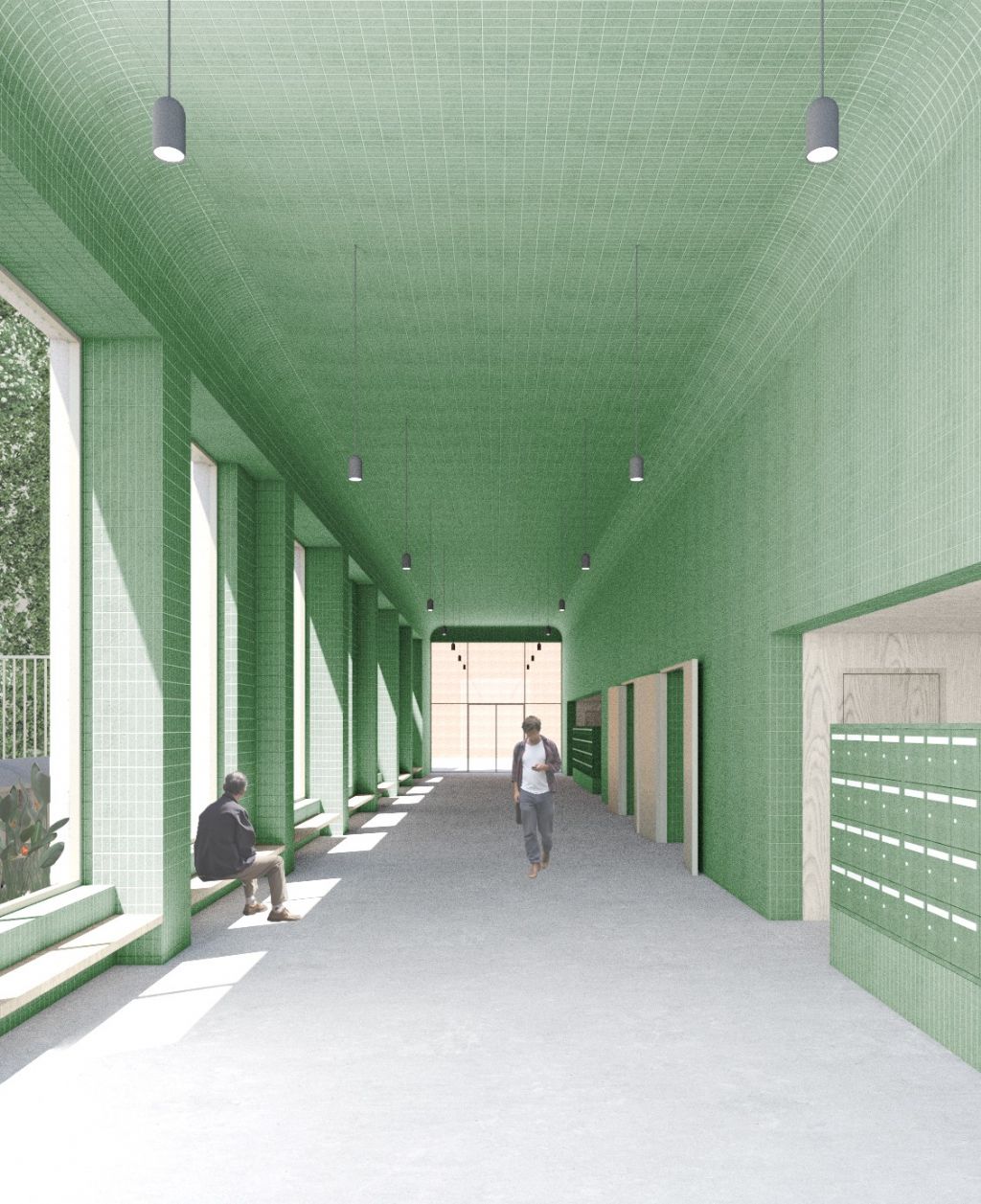 Het bouwprogramma omvat in hoofdzaak woonfuncties met een zeer divers aanbod gaande van kleine studio’s tot drieslaapkamerappartementen, verspreid over vijftien bouwlagen. Het concept is opgevat als een woonvorm waarbij sterk is ingezet op de collectieve kwaliteiten van het gebouw, die verschillende facetten van het wonen ondersteunen. “Het komen en gaan van de bewoners zal niet in een kleine inkomhal gebeuren, maar in een ruime, bijna stedelijk aandoende passage, die ook als gebruiksruimte kan ingezet worden en waar mensen elkaar kunnen ontmoeten”, vertelt Bram Aerts, mede-zaakvoerder van TRANS. “Het is een ruimte tussen de stad en het wonen, waar veel natuurlijk daglicht zal toekomen.” In deze passage zijn twee grote liften voorzien waarin meerdere fietsen kunnen meegenomen worden naar de bovenverdiepingen. Daar kunnen ze in de collectieve fietsstallingen gestald worden of voor de deur van de appartementen. De woningen zijn namelijk bereikbaar via ruime gaanderijen, die opnieuw ontmoeting bevorderen.