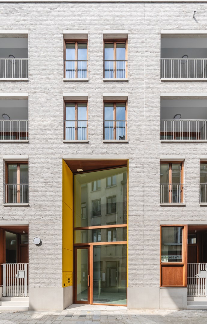 Speciale aandacht is besteed aan de inkomzones van de woningen. Dit is het deel van het gebouw dat de meest directe relatie aangaat met de publieke ruimte. De trap is een transitiezone tussen privé en publiek waar de bewoners in hun eigen plek aan de straat kunnen zitten. Ook de rest van de gevel is met zorg en detail ontworpen zodat deze het straatbeeld verrijkt. Hierin speelt het spel tussen open en gesloten geveldelen en de detaillering een belangrijke rol.