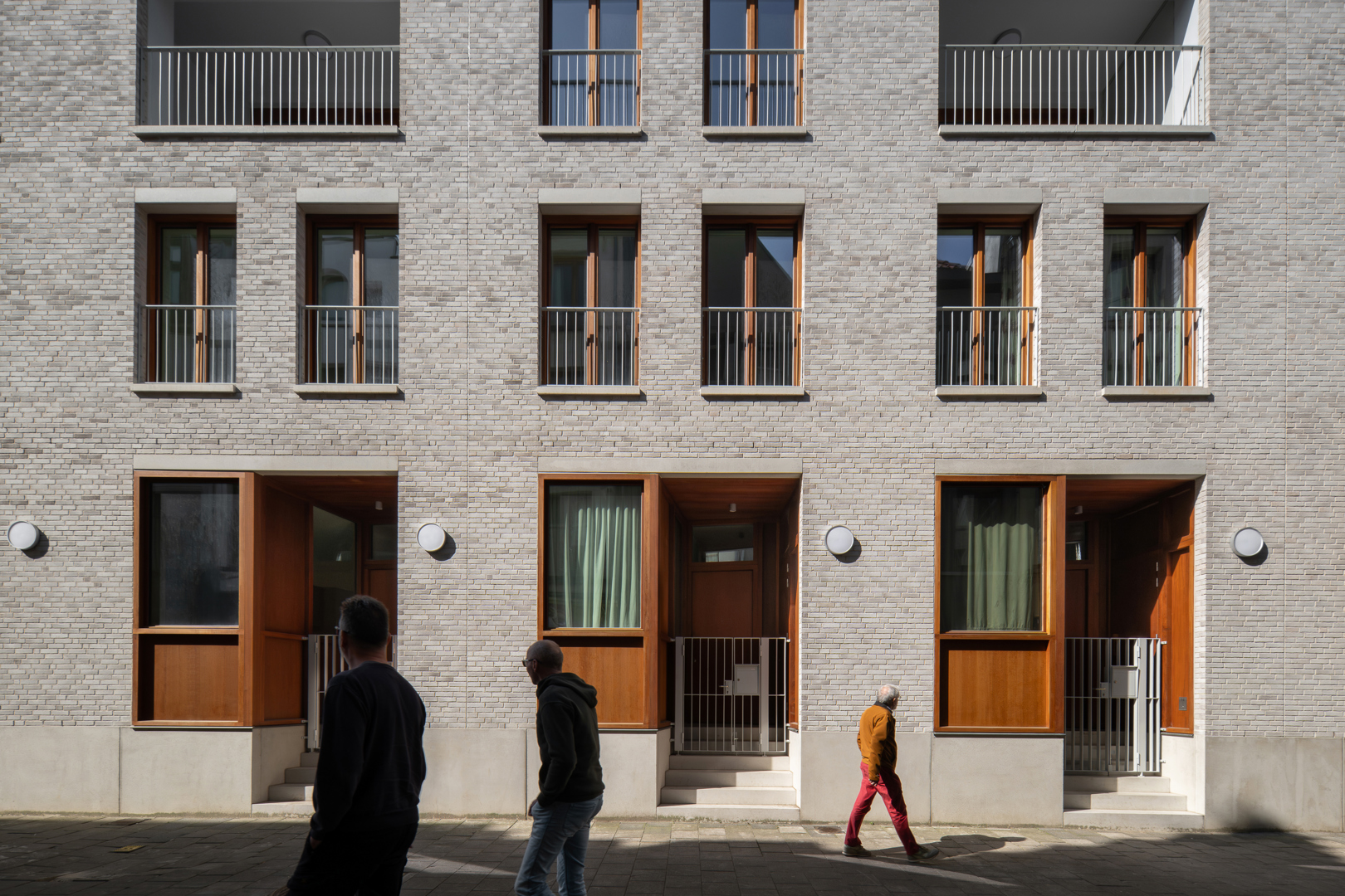 De inkompartijen van de maisonnettes, met hun uitgesproken houten portalen en kleine trapzones, zorgen voor een expressieve en herkenbare aanwezigheid in het straatbeeld. Binnen het bouwblok wordt ook informeel gewoond aan het steegje, wat de levendigheid van de plek versterkt. Zo ontstaat een woningtypologie die niet alleen beantwoordt aan ruimtelijke noden, maar ook inspeelt op sociaal gedrag in een stedelijke omgeving.