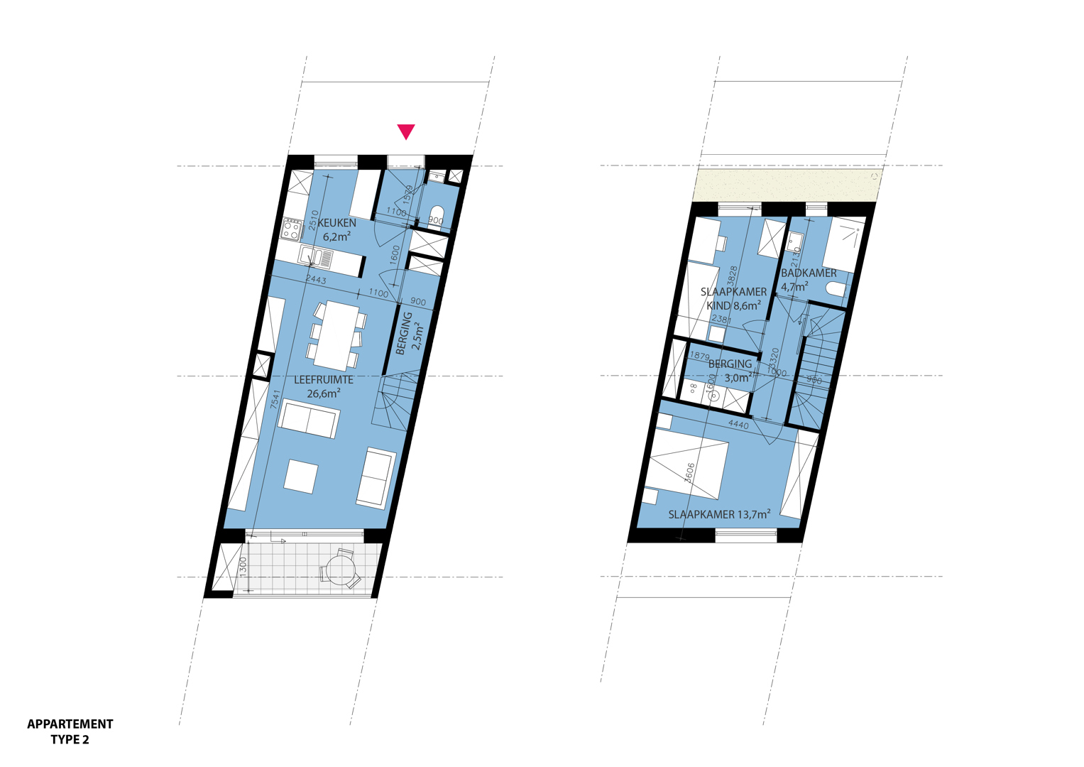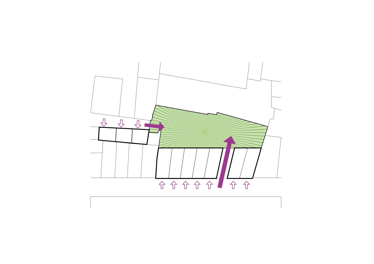 Aan de achterzijde verbindt een verhoogd terras de woningen met de gedeelde binnentuin, bereikbaar via een dubbelhoge inkomhal. Binnenin zijn de circulatieruimtes en passerelles bewust ruimer en informeler opgevat. Ze fungeren als plekken waar bewoners elkaar spontaan kunnen ontmoeten. Het volledige project, inclusief de bovenliggende appartementen, is bovendien ontworpen met aandacht voor toegankelijkheid voor mensen met beperkte mobiliteit.