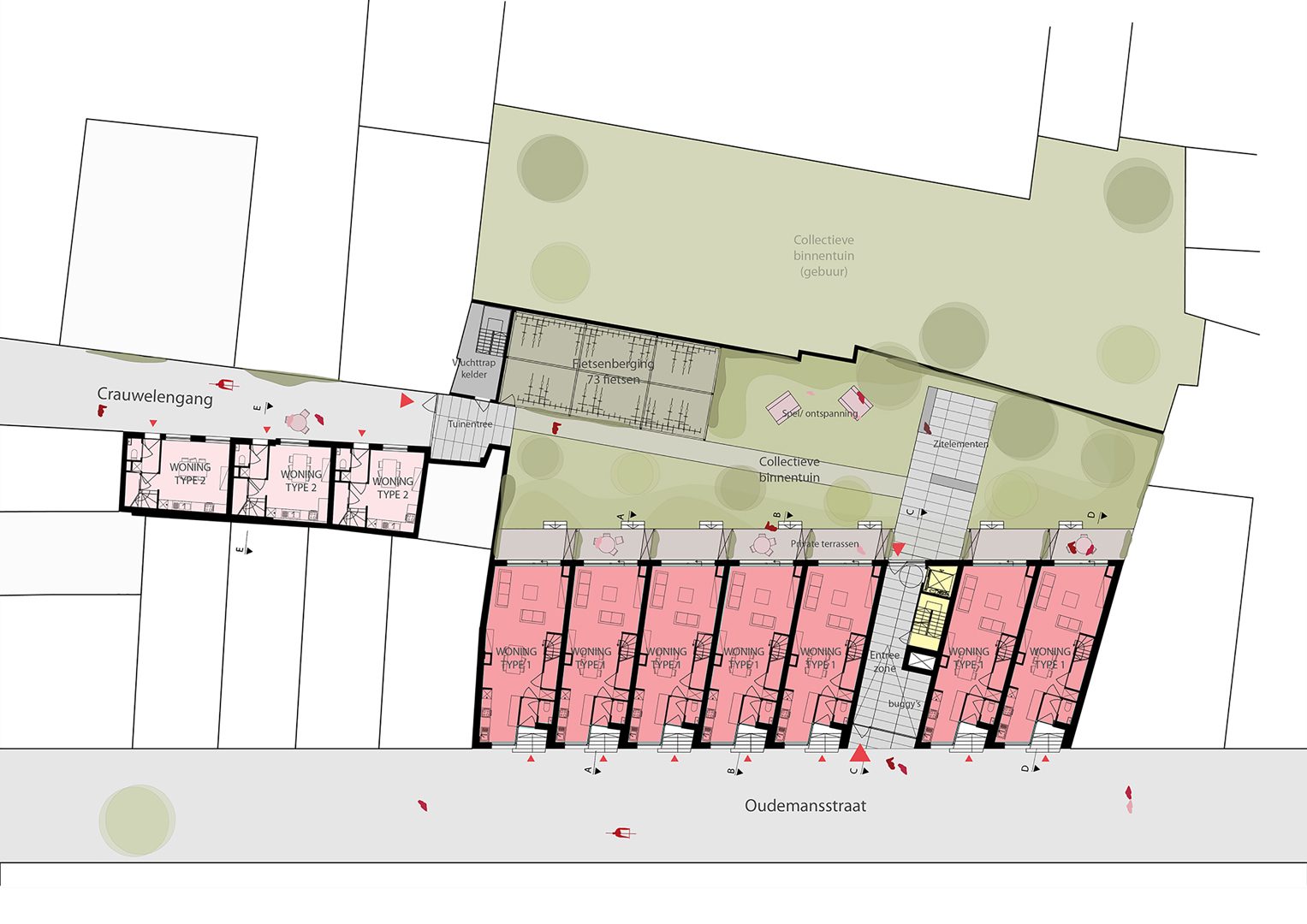 Op de site, gelegen aan de Oudemansstraat en de Crauwelengang, realiseerden de ontwerpers compacte, betaalbare woningen met een uitgesproken stedelijke uitstraling. Aan de straatzijde versterkt een robuust gevelraster met metselwerk en houten schrijnwerk het ritme van de buurt, terwijl aan de achterzijde een slanke staalstructuur een collectieve binnentuin inkadert. Daarmee krijgt het binnengebied een onverwacht groene en open dimensie, midden in de stad.