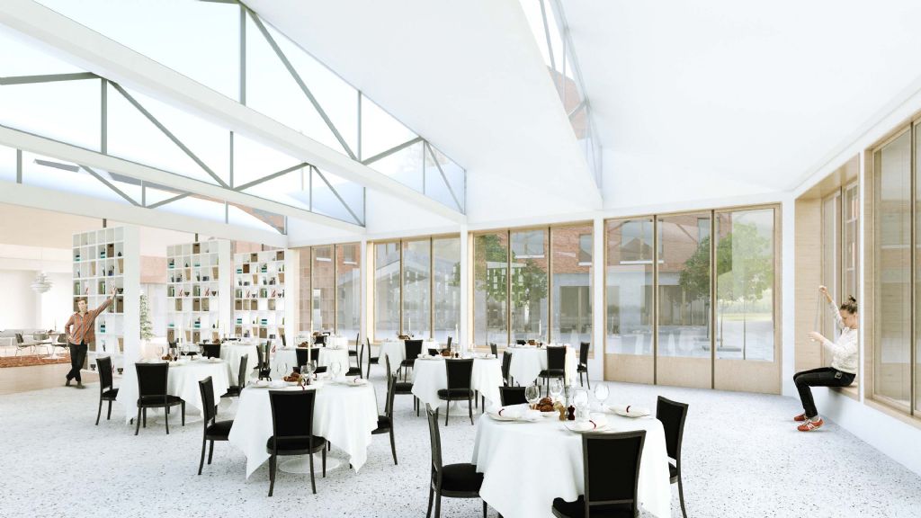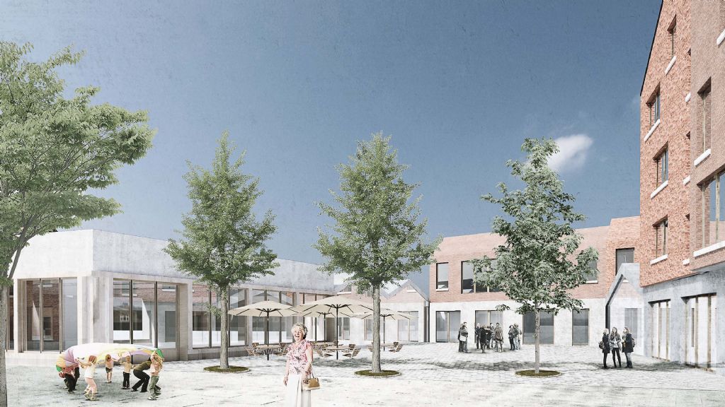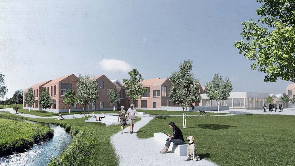 Beide bouwpartners geven de site geen uitstraling van een campus maar eerder van een zorgdorp. Centraal op de site bevindt zich een dorpsplein met daarrond de publieke voorzieningen zoals het onthaal, de bistro en het dagverzorgingscentrum. “Deze opstelling moet garanderen dat er voldoende dynamiek heerst in het hart van de site”, klinkt het bij lava architecten. “Ook buitenactiviteiten vinden hier hun plaats met onder meer ruimte voor sport, een buitentribune voor theater en terrassen aan de Wingebeek. Een centraal toegangspad doorkruist de site en linkt ze aan de twee toegangswegen. Zo zetten we letterlijk de perceelgrenzen open en laten we de buurt toe om deel uit te maken van de site.”