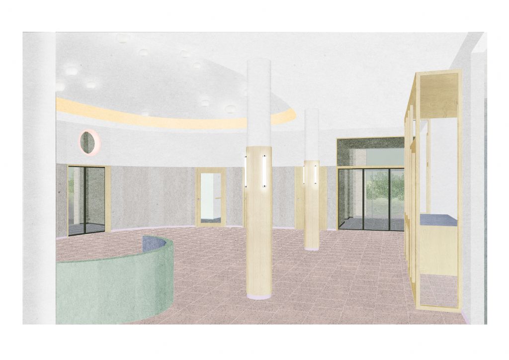 De ontwerpers hebben de doorsteek langs het woonzorgcentrum als een belevenis opgeladen. In plaats van langs een groot gebouw te fietsen, rij je er dwars doorheen. Zo worden gebouw en passant intens bij elkaar betrokken. Deze doorsteek wordt formeel in het gebouw aangezet, zodat het publieke karakter duidelijk voelbaar is.