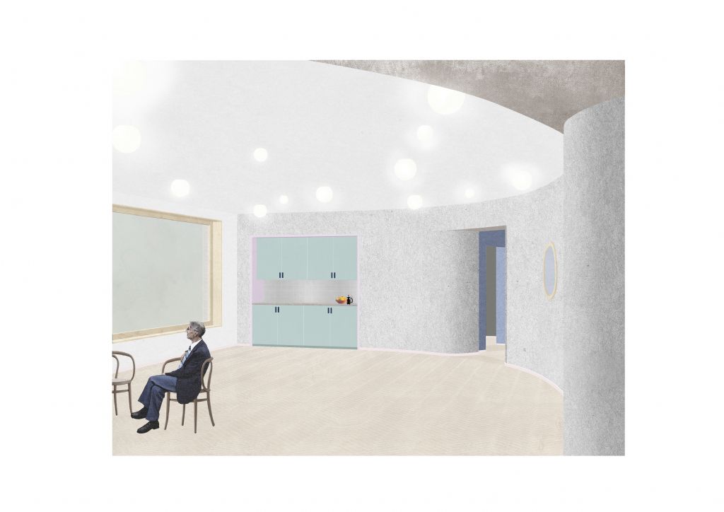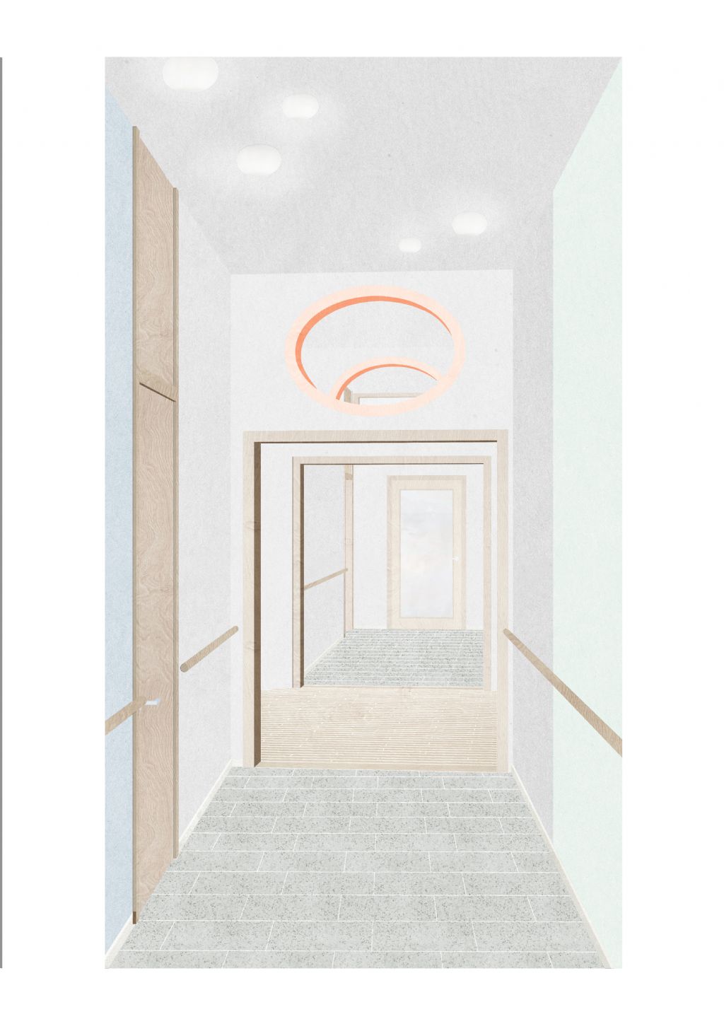Het gebouw zelf is opgevat als een enfilade van momenten, die de bewoners een geanimeerde passage biedt. Deze momenten ontstaan door variatie op een consequente vormentaal, materialiteit en kleurkeuze. De gangen op de eerste verdieping zijn bijvoorbeeld voorzien van een vijftal rustplekken, variërend van een bankje tot een ruime zithoek met uitzicht op de tuin.