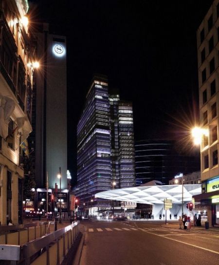De patio en het busstation worden overdekt door een grote, ronde stalen luifel met een centrale sokkel die uitkraagt zowel over het plein als over de Kleine Ring. Het geheel is opgebouwd uit driehoekige structuren en wordt afgedekt met een opgespannen ETFE-folie. De sokkel zelf zal ingericht worden als bar. De werken zouden in 2014 afgerond moeten zijn. De herinrichting van het Rogierplein is het resultaat van een samenwerking tussen Xavier De Geyter Architects, de aannemer In Advance, studiebureaus Boydens, Ney & Partners en Technum. Michel Desvigne Paysagiste verzorgde het landschap.
