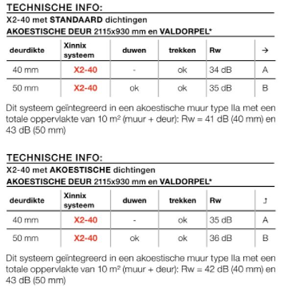 Voor het akoestisch deurgeheel vertrekt men vanuit een deurblad met geïntegreerde valdorpel en vanuit het systeem X2-40V dat een kopstuk met een aanslag heeft. Aan de hand van de tabel hierboven wordt duidelijk dat een akoestische dichting een betere akoestische waarde geeft dan de standaard dichting. Verder maakt ook de dikte van het deurblad een verschil. Toegepast in een akoestische wand, bekomt men de realistische situatie: ruimtes kunnen doeltreffend akoestisch afgesloten worden met Rw-waarden tot 43 dB.