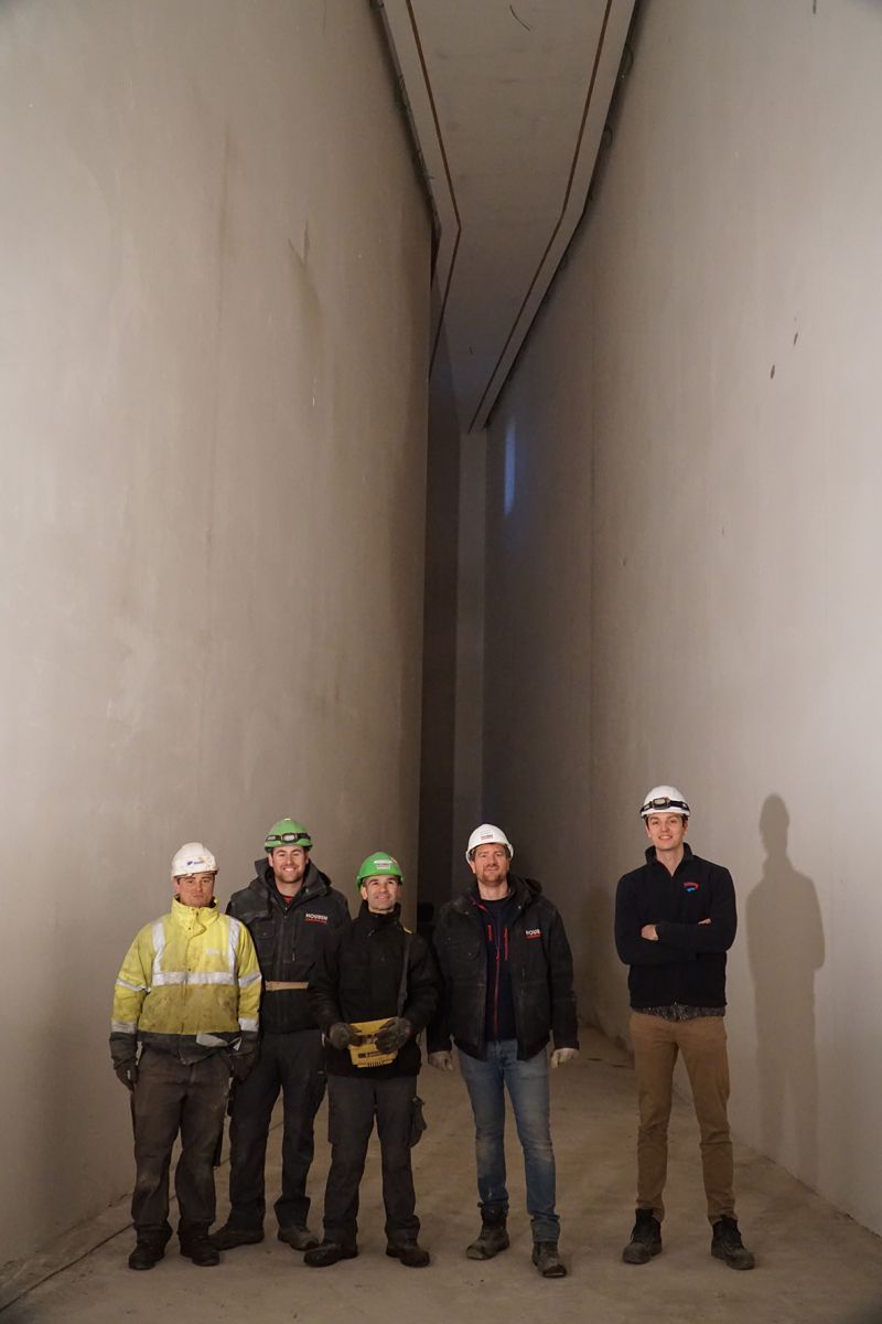 Het strakke ontwerp van de Italiaanse architecte Francesca Torzo voorziet geen standaard zichtbare ventilatieroosters. “Er zijn kleine ventilatiespleten voorzien aan de zijkanten van de vloeren, ter hoogte van de muur. De vloeren lijken daarom zwevend gemaakt. Voor deze constructie hebben we overal speciale bekisting geplaatst, deze bekisting blijft ook dienst doen als luchtkanaal. Er was wat creatief denkwerk voor nodig om samen met het team tot een oplossing te komen. Maar die uitdagingen zijn juist het leuke aan deze werf. De constructie was een tijdsintensief werk maar het geeft een zeer mooi en uniek resultaat,” besluit Kristof trots.
