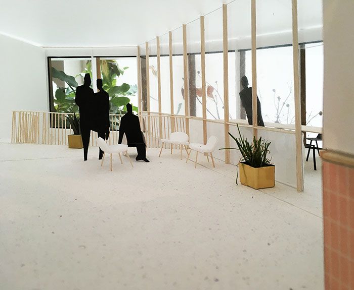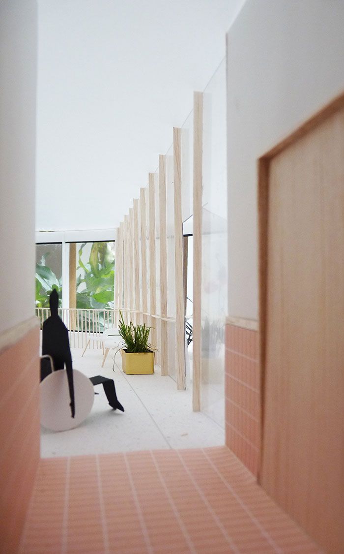 Marit Meganck: "Door gebruik te maken van de sterkte helling in het terrein kunnen we ervoor zorgen dat alle gebruikers op hun leefniveau naar buiten kunnen, zonder een lift of trap te moeten gebruiken. Dit is een grote troef voor de bewoners met hun beperkte mobiliteit. Voor de binnenafwerking hebben we gekozen om met veel verschillende materialen te werken. Zo voorzien we een lambrisering in de gangen met hout en terracotta tegels. Door veel warme materialen te gebruiken kunnen we de bewoners een huiselijk gevoel bezorgen."