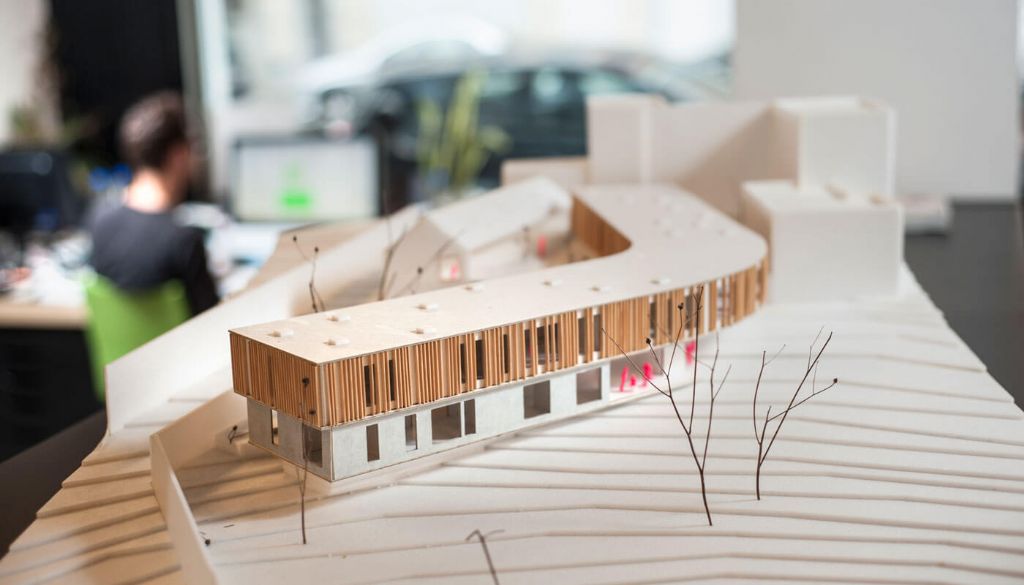 Zampone, in samenwerking met Madam Architectuur, kiest voor een nieuwbouw discreet tussen de bestaande gebouwen. Twee balken, twee bouwlagen. Maar niet overal. Het spel met bouwlagen laat de bestaande weg passeren en creëert een overdekte parkeergelegenheid maar ook en vooral ontstaat er zowel een geborgen daktuin als weidse uitzichten.
