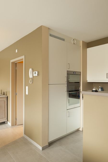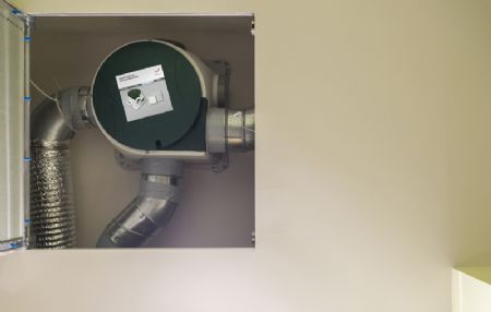 Architect Stijn Van Loon: “Het gebouw bestaat uit compacte appartementen – de oppervlakte varieert tussen pakweg 80 en 120 vierkante meter – met één of twee slaapkamers. De drie duplexappartementen hebben daarnaast nog ruimte onder het dak voor een eventuele extra kamer. Logischerwijs kregen de ventilatie-units een plek in de berging.” Zoals in elk C-systeem, zuigt deze unit de gebruikte lucht af uit de vochtige ruimtes, zoals badkamer en keuken, terwijl de verse lucht binnenkomt via ventilatieroosters in de droge ruimtes, zoals living en slaapkamers. Ludo Van Bergen vult aan: “De afzuiging gebeurt via plafondroosters en kanalen in het verlaagde plafond. We kozen voor spiraalbuizen, omdat de luchtsnelheid daarin lager is en de luchtstroom zo dus minder geluid genereert.”