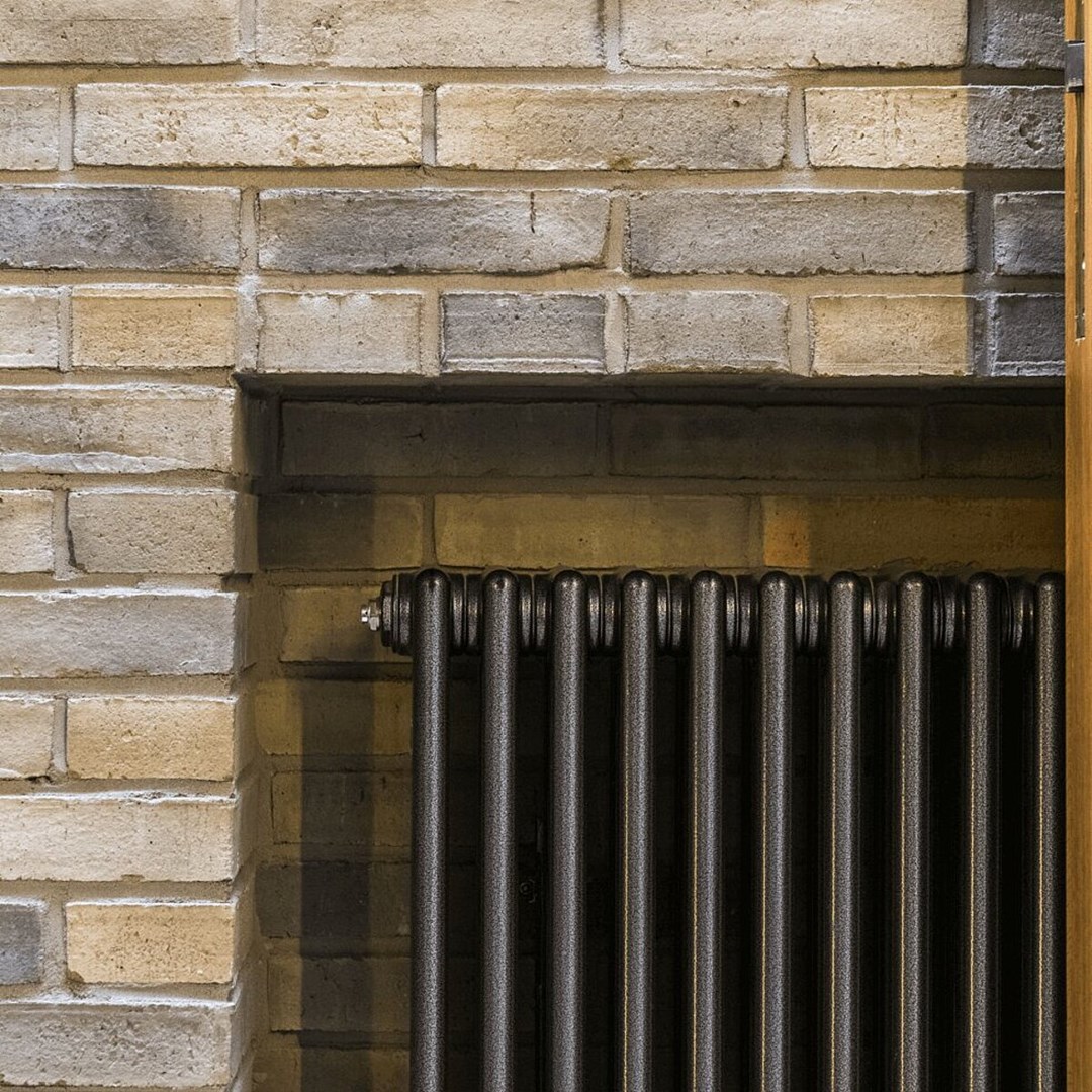 De keuze viel op de Zehnder Charleston radiator, niet alleen vanwege zijn functionaliteit maar ook vanwege zijn esthetiek die naadloos aansluit bij het authentieke karakter van Het Steen. Deze radiatoren, uitgevoerd in een speciale zwart-zilveren hamerslagkleur, versterken de historische ambiance van het kasteel terwijl ze toch moderne warmte bieden.