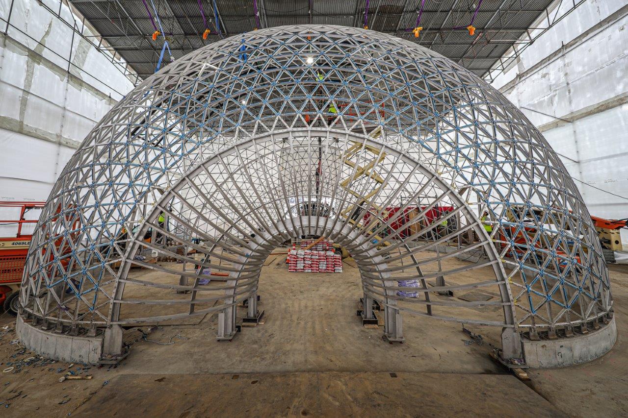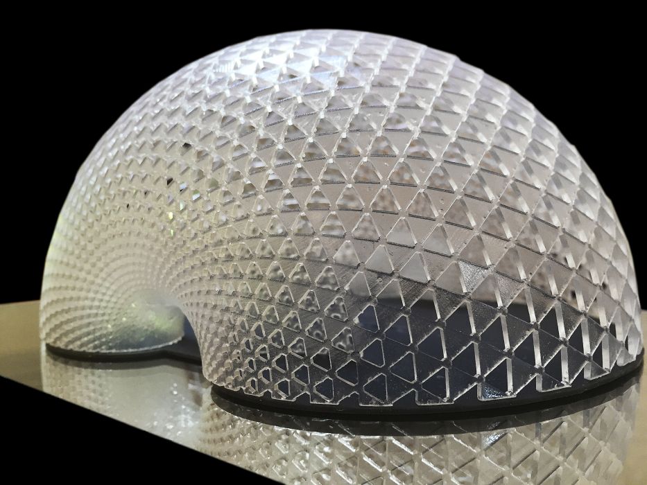 Het glazen paviljoen van Philippe Samyn is een architecturale wereldprimeur en een technisch hoogstandje. Zo is het gebeente van de koepel een zelfdragende “isoknoopstructuur”. Die bedacht Philippe Samyn al in 1971 aan het Massachusetts Institute of Technology (MIT) als oplossing voor een geometrische quasi-onmogelijkheid: een koepel bouwen met bijna identieke verbindingspunten. Dunne profielen van gepolijst roestvrij staal geven vorm aan het gebeente en omsluiten de glasdriehoeken. Ook de glasstukken zelf spelen een rol in de stabiliteit van de structuur: ze houden de buisvormige profielen op hun plaats en dempen vervormingen via hun siliconen pakking waarmee ze aan het gebeente zijn bevestigd.