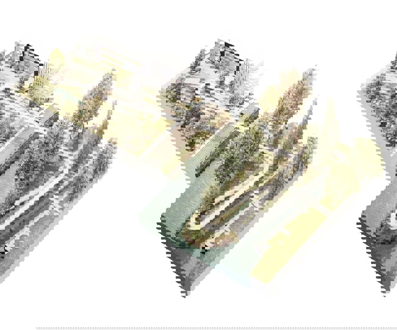 Aan de oostzijde is de helling zoveel mogelijk achter groen geplaatst om een natuurlijke overgang te creëren tussen fietspad en woonomgeving. Nieuwe bomen, zitelementen en een wadi die regenwater opvangt, versterken de landschappelijke inbedding. De brug kruist zichzelf en biedt bij elke bocht een nieuw perspectief op de omgeving. Zo ontstaat een beleving die meer is dan een functionele oversteek: een ruimtelijke sequentie die de fietser laat meanderen tussen water, erfgoed en natuur.