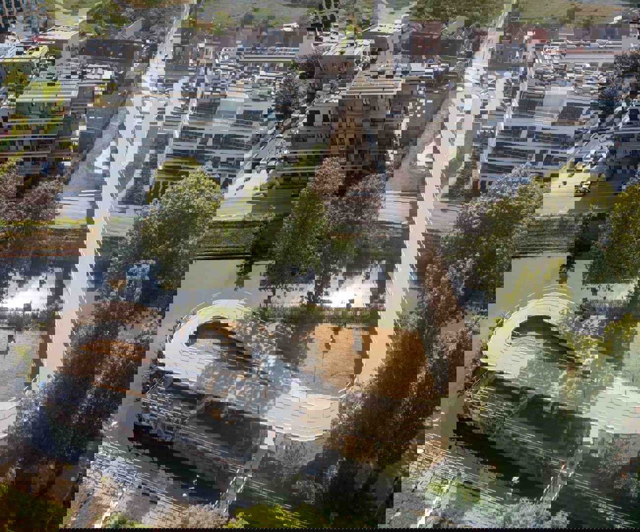 Bijzonder is ook de fundering op het sluiseiland, vlak naast de historische sluiswanden. Om het erfgoed te beschermen, werden de funderingspalen niet rechtstreeks onder de pijlers geplaatst, maar verbonden via ondergrondse evenwichtsbalken die de belasting spreiden. Zo blijft het monumentale sluiskomplex intact, terwijl de nieuwe brug zich als een lichte, zwevende lijn tussen stad en park ontvouwt. De Suikerbrug toont hoe hedendaagse infrastructuur, met oog voor detail en context, een stad niet enkel verbindt, maar ook verrijkt.