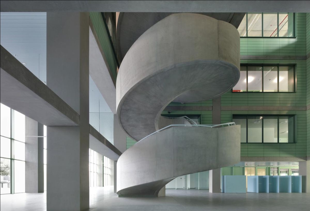 Een monumentale draaitrap leidt vanaf de onthaaldesk naar de consultatiezone en het kenniscentrum van ZNA. Tegelijk wordt de publieke boulevard in hetzelfde materiaal doorgetrokken naar niveau +3 waar een panoramisch terras een mooi uitzicht biedt. Met de centrale inplanting eist het ziekenhuis terug zijn cruciale rol op in het leven van alledag. Het prominente torenvolume in groen en blauw versterkt de aanwezigheid voor de hele stad.