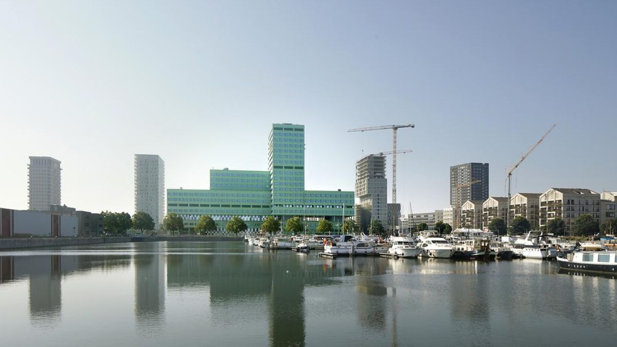 Ook voor de omliggende stad bieden de groene en blauwe gevels een levendige blik.