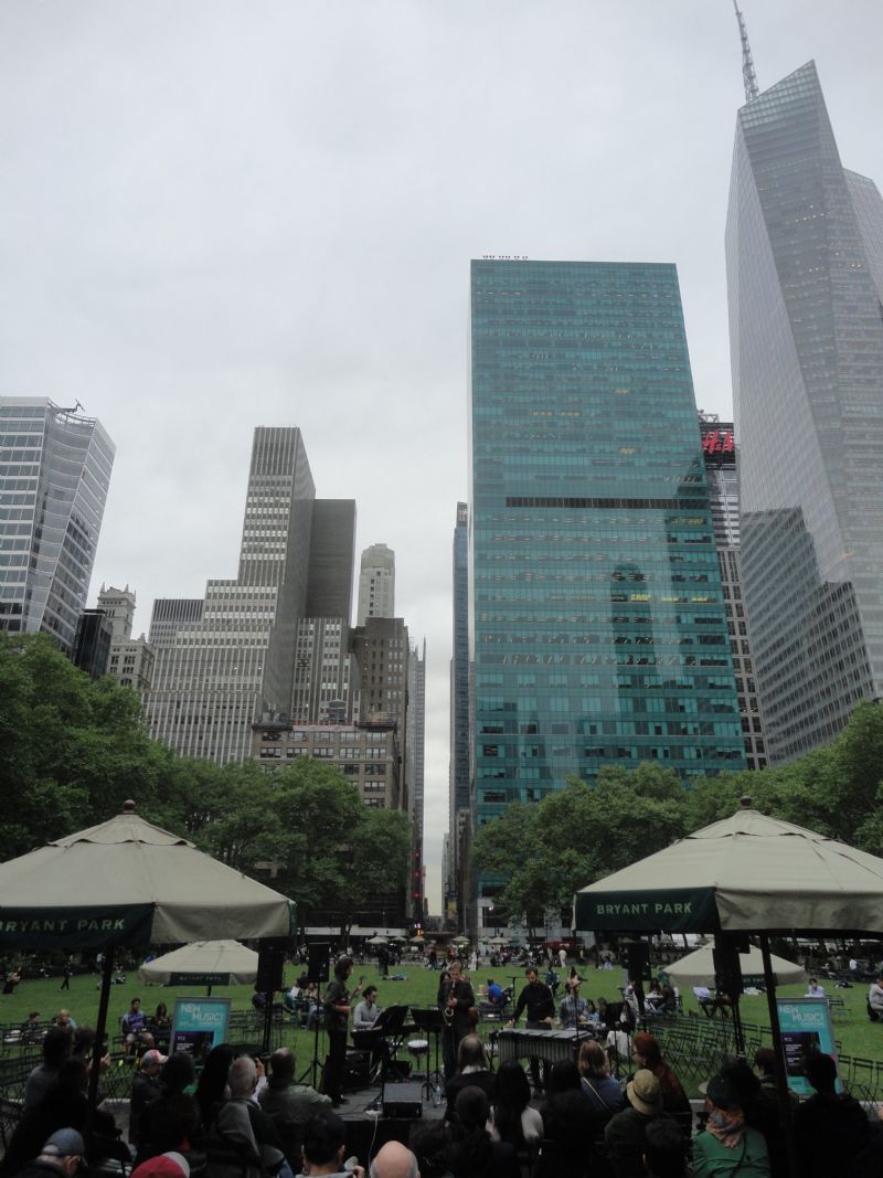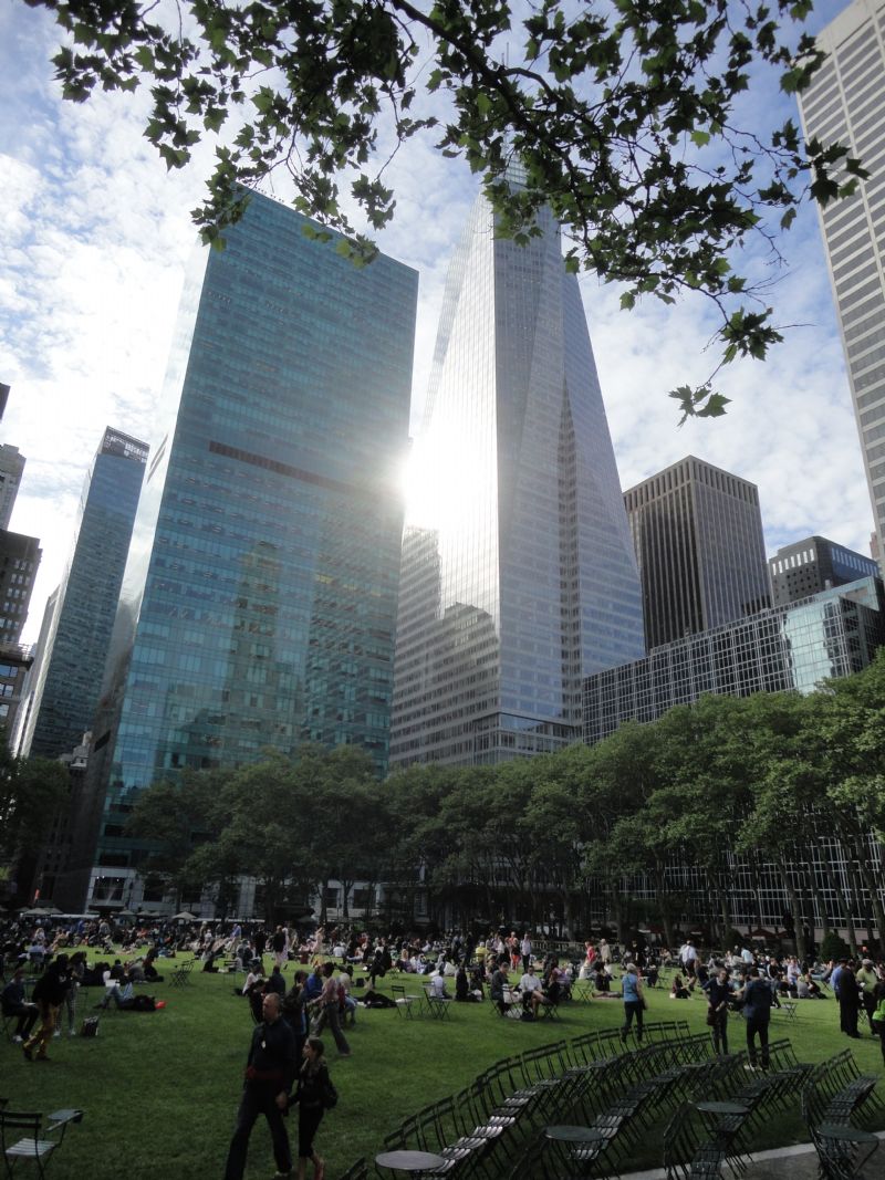 Bryant Park, middenin Midtown Manhattan, tussen 5th en 6th Avenue en 40th en 42nd Street, biedt vier hectaren boordevol en boordeleeg stedelijke rust, een groen eiland op een groot eiland in de wereldstad, een plek, die nog sterker werkt dan Central Park. In Bryant Park komen ’s middags duizenden mensen hun lunch opeten, wordt de ganse dag door uitgerust, gebabbeld en gekeken, zittend op een van de ontelbare metalen stoelen of gewoon op het meer dan kamerbreed gras. Hier overheersen licht en zon en hemel overvloedig terwijl acteurs met een Iers accent Shakespeare opvoeren, volwassenen Monopoly spelen of schaken, kinderen voorgelezen worden, de draaimolen schittert of een jazzband ingetogen het vallen van de avond begeleidt.