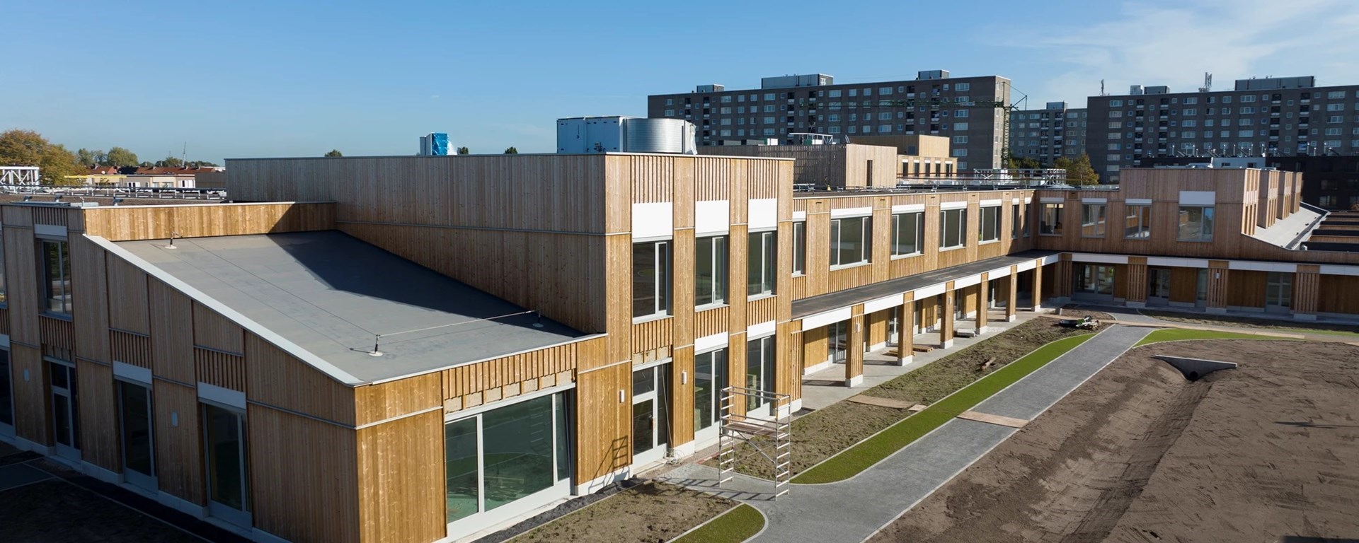 Zo’n 95% van het gebouw is opgetrokken uit hout. De enige gebouwdelen die niet in hout zijn uitgevoerd, zijn de betonnen liftkokers, de technische lokalen met onder meer de hoog- en laagspanningsborden, in metselwerk, en de verhoogde speelplaats, in staalplaatbeton. Volgens cijfers van PEFC verdwenen er 21.350 bomen in de nieuwe zorgcampus – een aantal dat dus opnieuw wordt aangeplant en de tijd krijgt om even groot te worden als de gerooide bomen – en capteert het gebouw zolang het er staat 4.428 ton CO2 of 1 ton CO2 per m³. CLT is dan ook CO2-negatief: het haalt meer broeikasgas uit de lucht dan dat er vrijkomt bij het transport en het toepassen van het CLT. “Bovendien zorgt deze droge bouwmethode voor een maximale flexibiliteit en aanpasbaarheid van het gebouw”, aldus Jona Michiels.