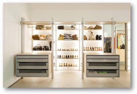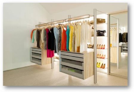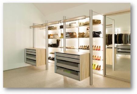 DRESSWALL is een zwevende modulaire structuur die met verticale geanodiseerde aluminiumprofielen een open dressing of inloopkast creëert. De dressing wordt naar keuze op de wand, tussen vloer en plafond of volledig vrijstaand gemonteerd. Optioneel kunnen de aluminium profielen voorzien worden van functionele ledverlichting over de gehele profiellengte.