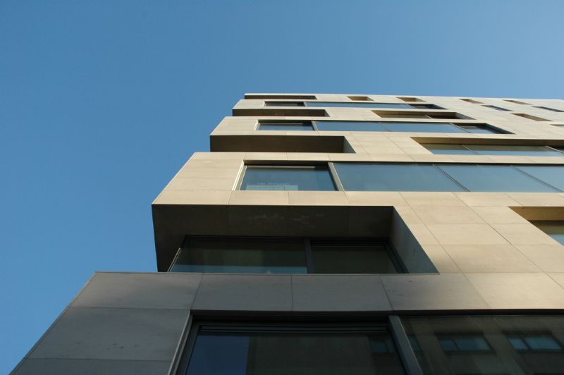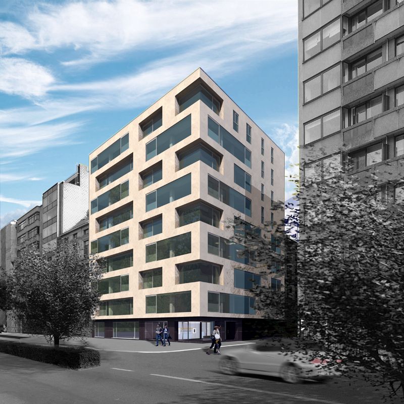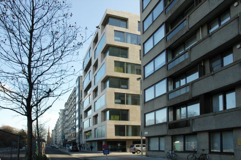 Het Jenga spel was de inspiratiebron voor het ruimtelijk ontwerp van dit appartementsgebouw. De verschuivende gevellijnen, de in- en uitspringende verdiepingshoge raampartijen en de natuurstenen gevelbekleding versterken het idee van een monoliet met uitsnijdingen. De gevelomsluiting is in detail uitgewerkt, de raamprofielen volledig weggewerkt.