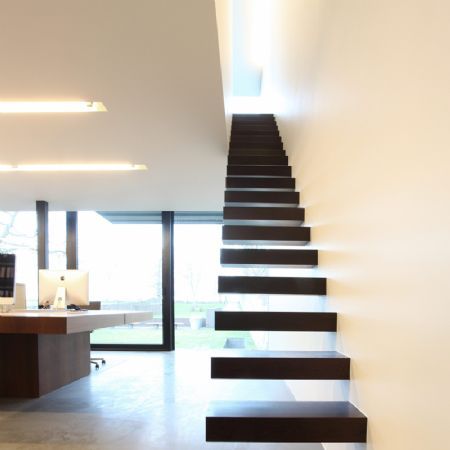 Sinds 2004 houdt Egide Meertens kantoor in een vrijstaand gebouw achter zijn ouderlijk huis. Dit kantoor werd echter al gauw te krap en de architect besloot uit te breiden. Bovenop het bestaande volume, een balk bekleed met betonpanelen, ontwierp hij een contrasterend volume in geprepatineerd zink dat er als een losse doos lijkt bovenop te liggen.Het nieuwe volume werd geschrankt op het bestaande geplaatst en kraagt enkele meters uit. De achterzijde ervan wordt volledig in beslag genomen door een grote glaspartij die een weids uitzicht biedt op het achterliggende Haspengouwse landschap. Hierdoor ontstaat een gerichtheid naar het landschap toe, die nog versterkt wordt door de uitkraging in dezelfde richting. Deze configuratie zorgt er tevens voor dat de privacy van de buren en de voorliggende woning verzekerd blijven.