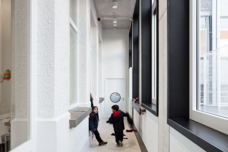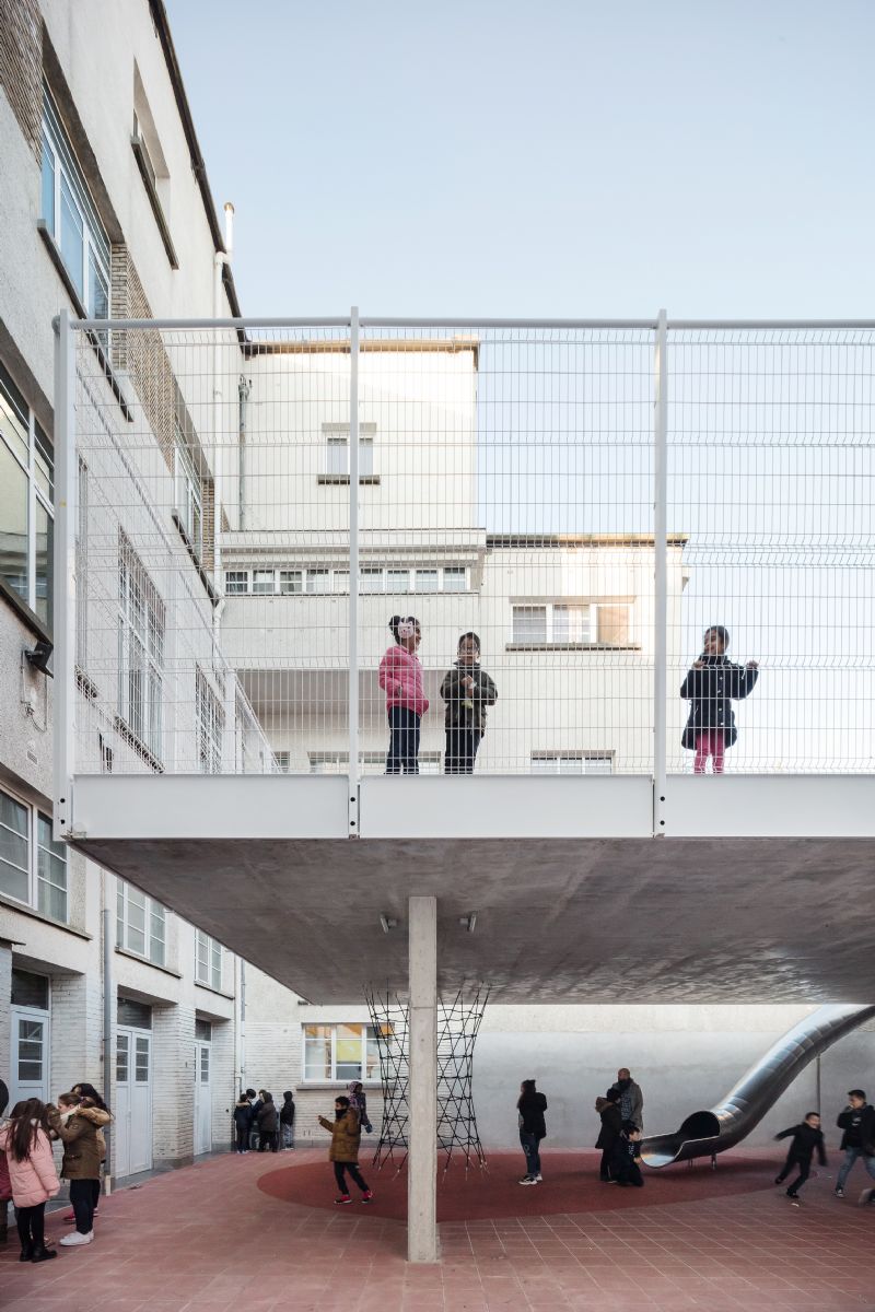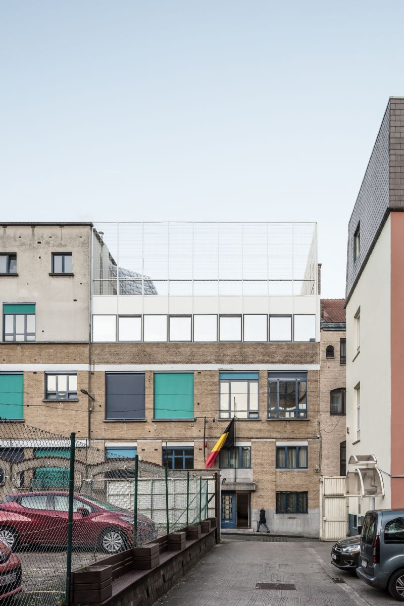 Label Architecture heeft de gemeentelijke basisschool Arc-en-Ciel en het kinderdagverblijf in Sint-Joost-ten-Node uitgebreid en gerenoveerd. De school is gelegen in de meest dense gemeente van Belgiƫ. De uitdaging was dan ook om een goed evenwicht te bewaren tussen de open en bebouwde ruimte. De nieuwe toevoegingen werden zo geschikt om de kwaliteit van de buitenruimte te garanderen.
