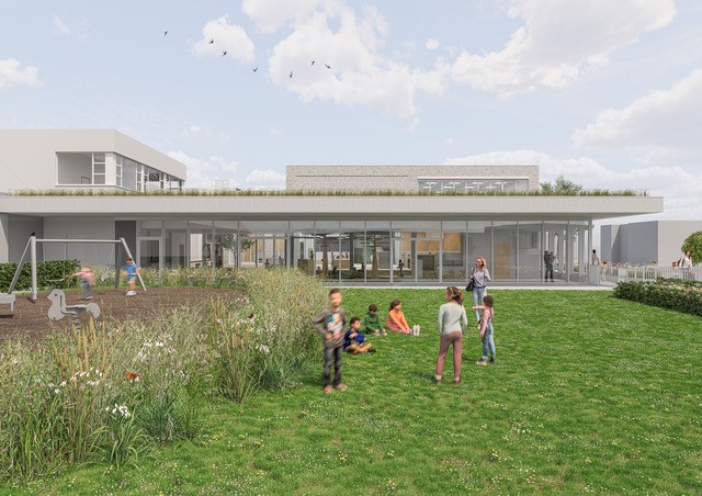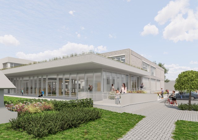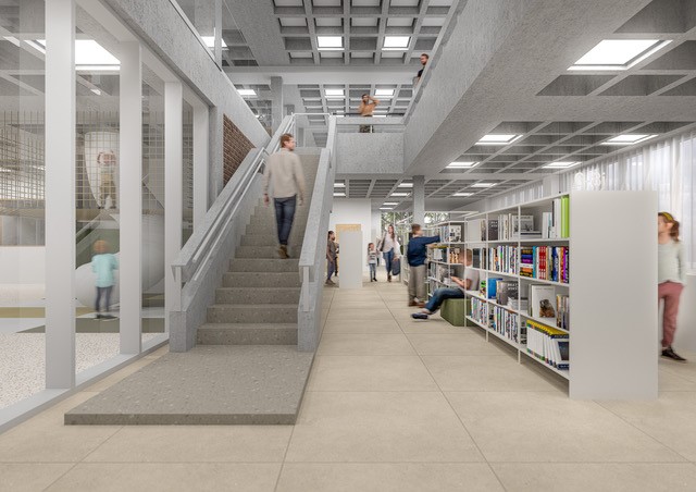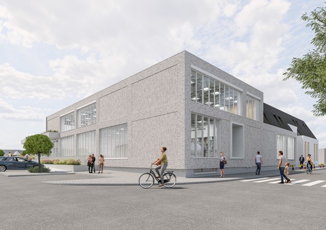 De bibliotheek van Kuringen (Hasselt) krijgt een grondige make-over. Het bestaande gebouw wordt gerenoveerd en uitgebreid met een buitenschoolse kinderopvang. De typerende brutalistische betonstructuur van het gebouw blijft behouden. De nieuwe vleugel creƫert een centrale patio tussen de bib en het bestaande schoolgebouw.