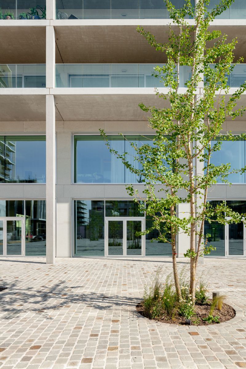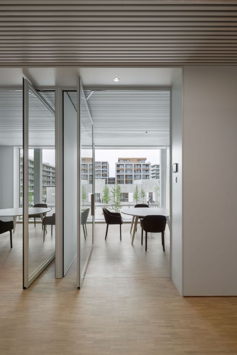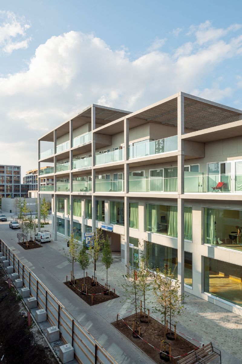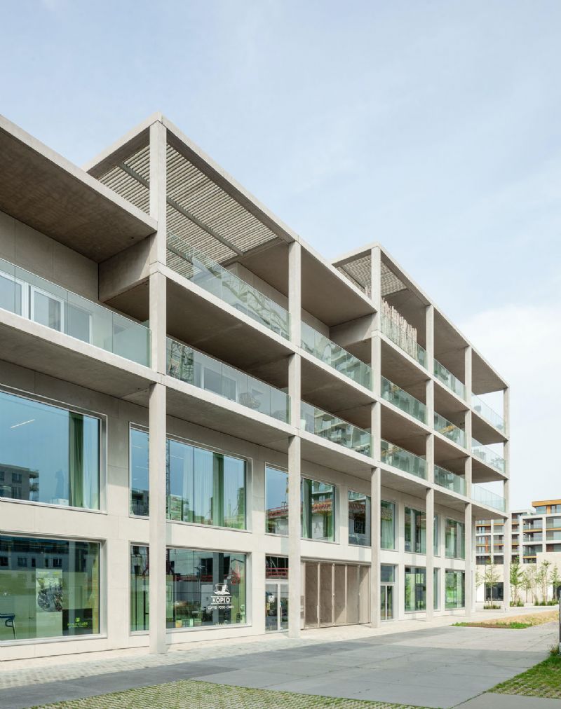 Het plein zal het centrum vormen van de nieuwe wijk met enkele duizenden bewoners. Het woonblok van Atelier Kempe Thill is opgezet met een heldere stapeling van functies. Op de begane grond bevinden zich ruimtes voor diverse commerciële doeleinden, met name restaurants en winkels, om het gebouw zo openbaar mogelijk te maken. De kantoren van de opdrachtgever bevinden zich op de eerste verdieping en zijn toegankelijk via een ruime entree op de begane grond. Deze vormen een gesloten ring rond de binnentuin met doorkijken door het gehele gebouw. Boven de kantoren bevinden zich drie woonlagen die door de toegangsportiek eenvoudig van de binnentuin zijn ontkoppeld en zo een eigen wereld vormen.