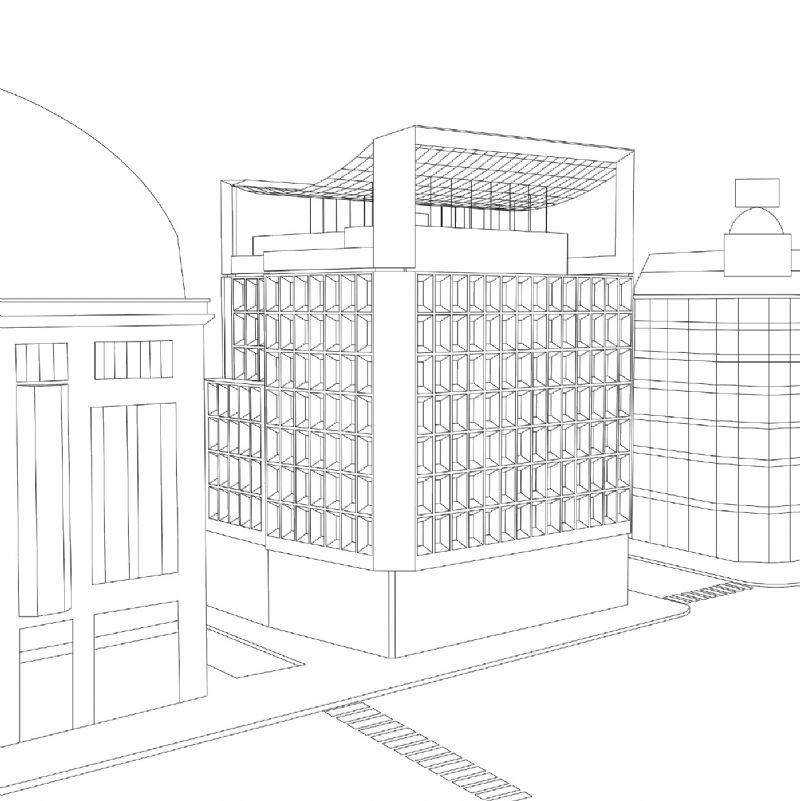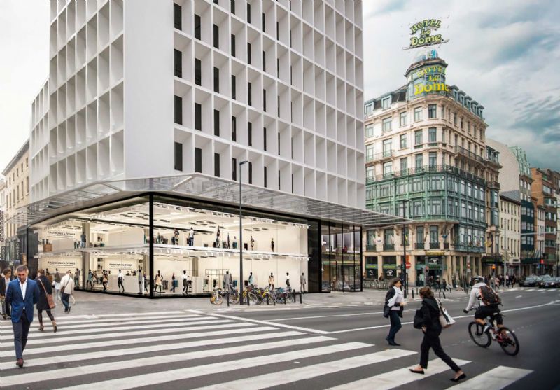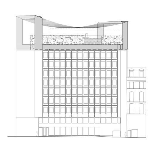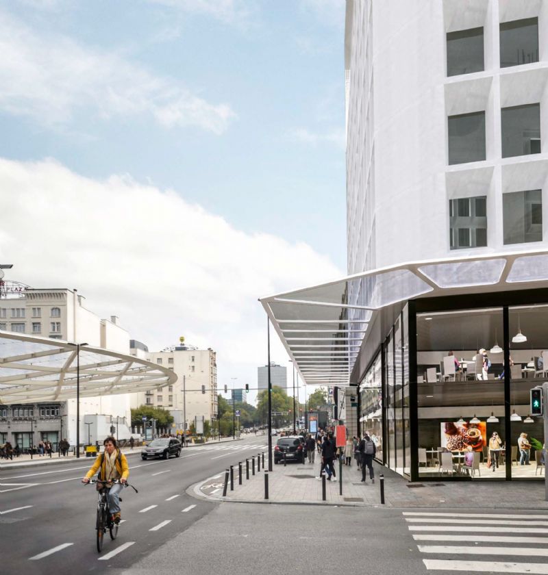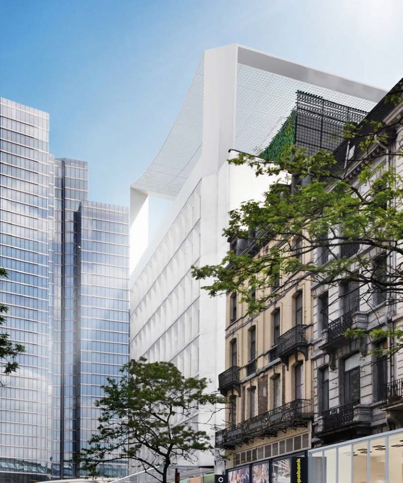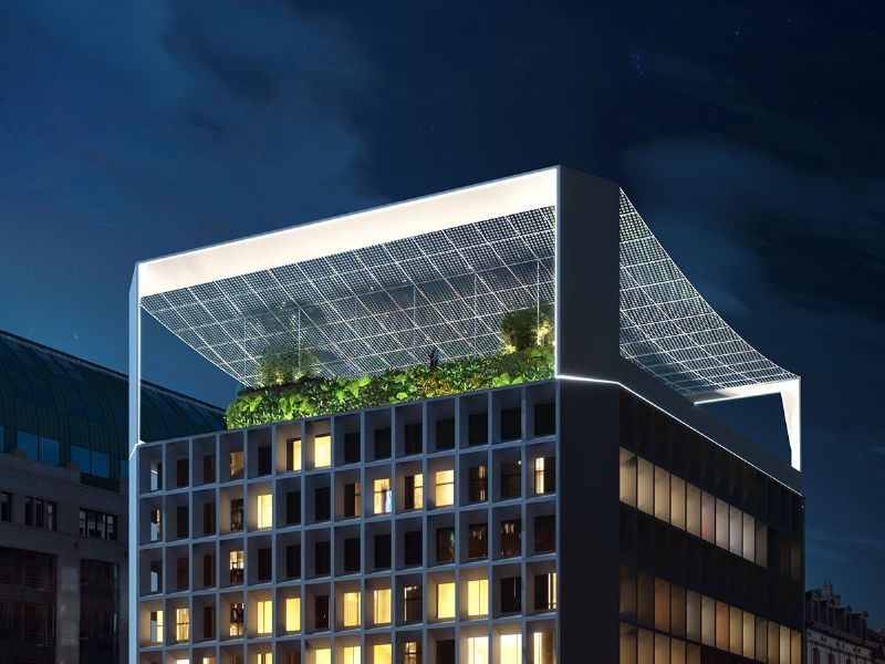 Een verouderd kantoorgebouw in het hart van Brussel krijgt een grondige make-over door middel van een monumentale fotovoltaïsche structuur. De monumentale fotovoltaïsche structuur bestaat uit twee witte metalen portieken van verschillende grootte. Daartussen vertoont het 800m² doorzichtige zonnepanelen dak een lichte boogvorm en zijn de panelen schuin naar het zuiden gericht. Deze bekroning van het gebouw zal 30% van de elektriciteitsbehoefte van het gebouw dekken. Onder de zonneluifel wordt op het dakterras een klein stedelijk park ingericht dat een 360° panorama biedt op het oude Brussel en de Noorwijk. De renovatie zal eveneens de optimalisatie van de 2200 m² commerciële invulling inhouden