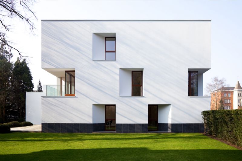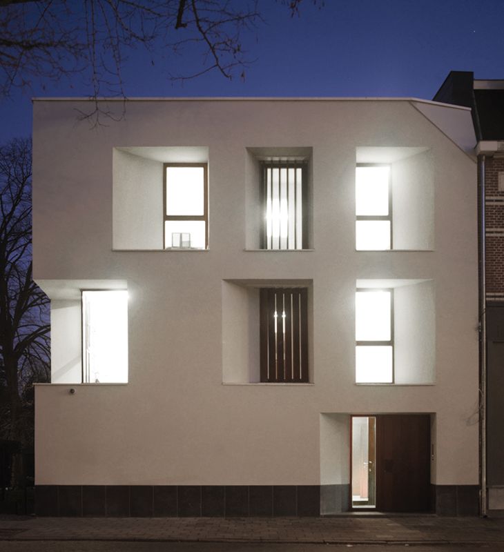 Aansluitend op de gevels van de belendende percelen wordt een gladde witte gevelbepleistering gebruikt. Het gebouw verkrijgt haar expressie door de toepassing van dieperliggende ramen en inpandige terrassen. De aldus ontstane nissen worden binnenin praktisch aangewend om kastruimte te creëren.