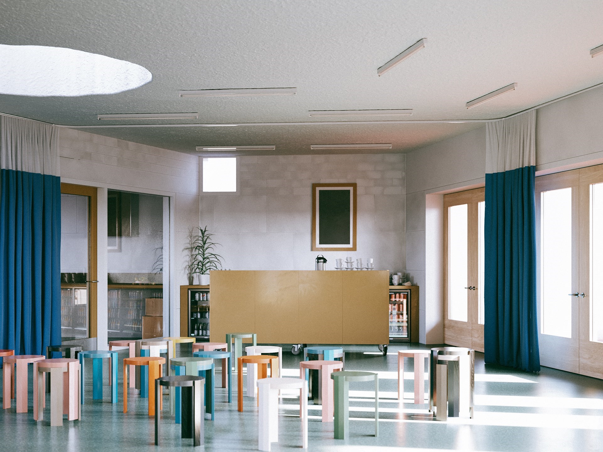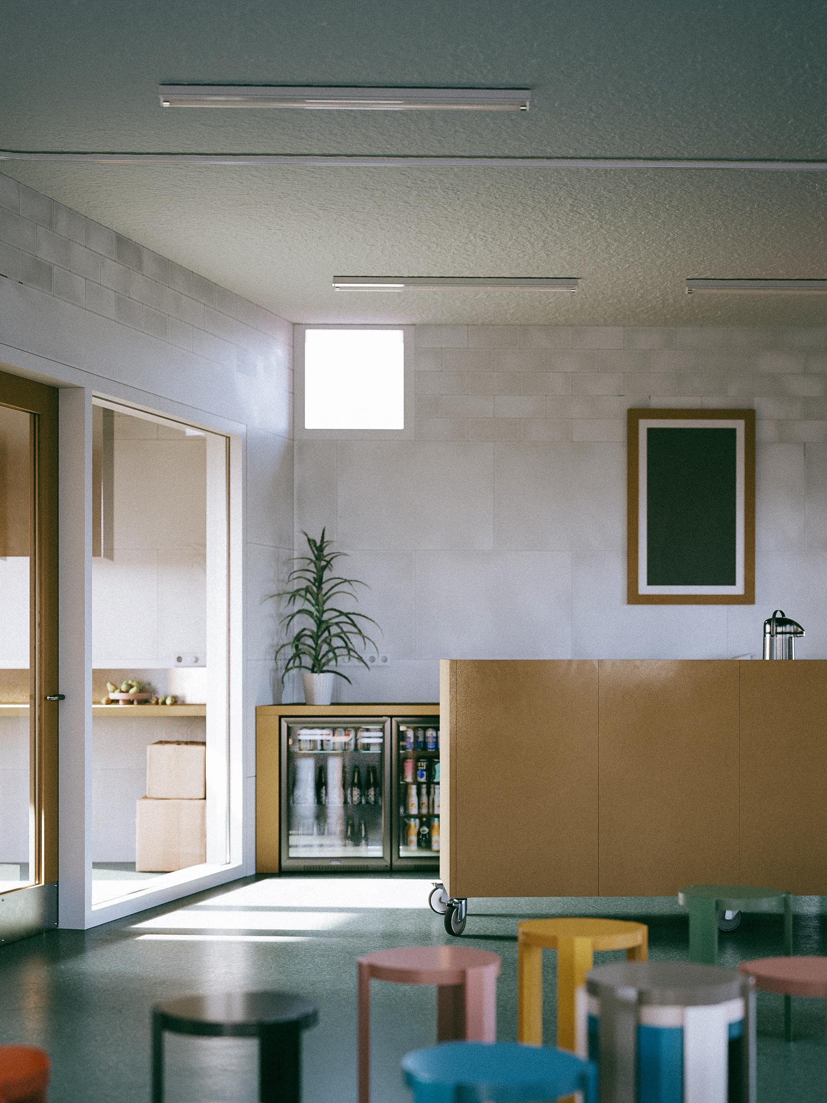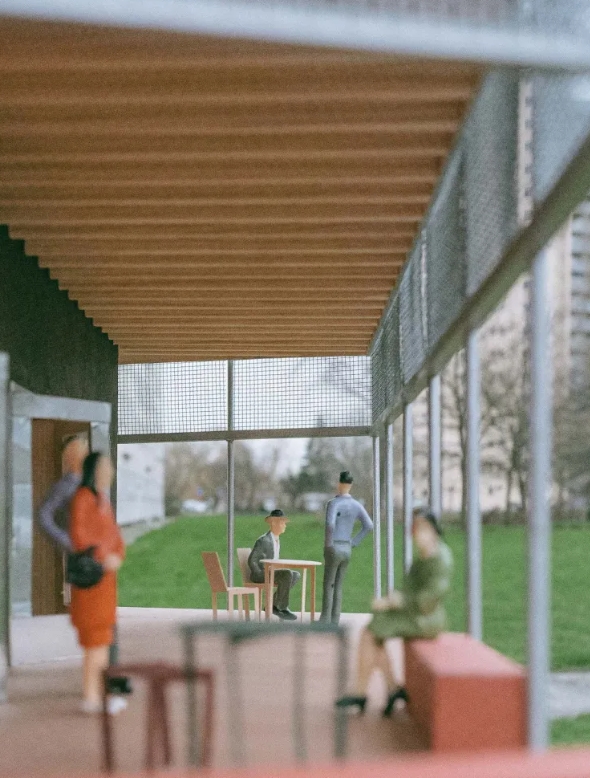 Het gebouw is in de eerste plaats als een ‘shelter’; een shelter voor de buurt. De fijnstalen buitengaanderij bemiddelt tussen gebouw en omgeving; in alle richtingen. Hier is niet binnen. Hier is niet buiten.