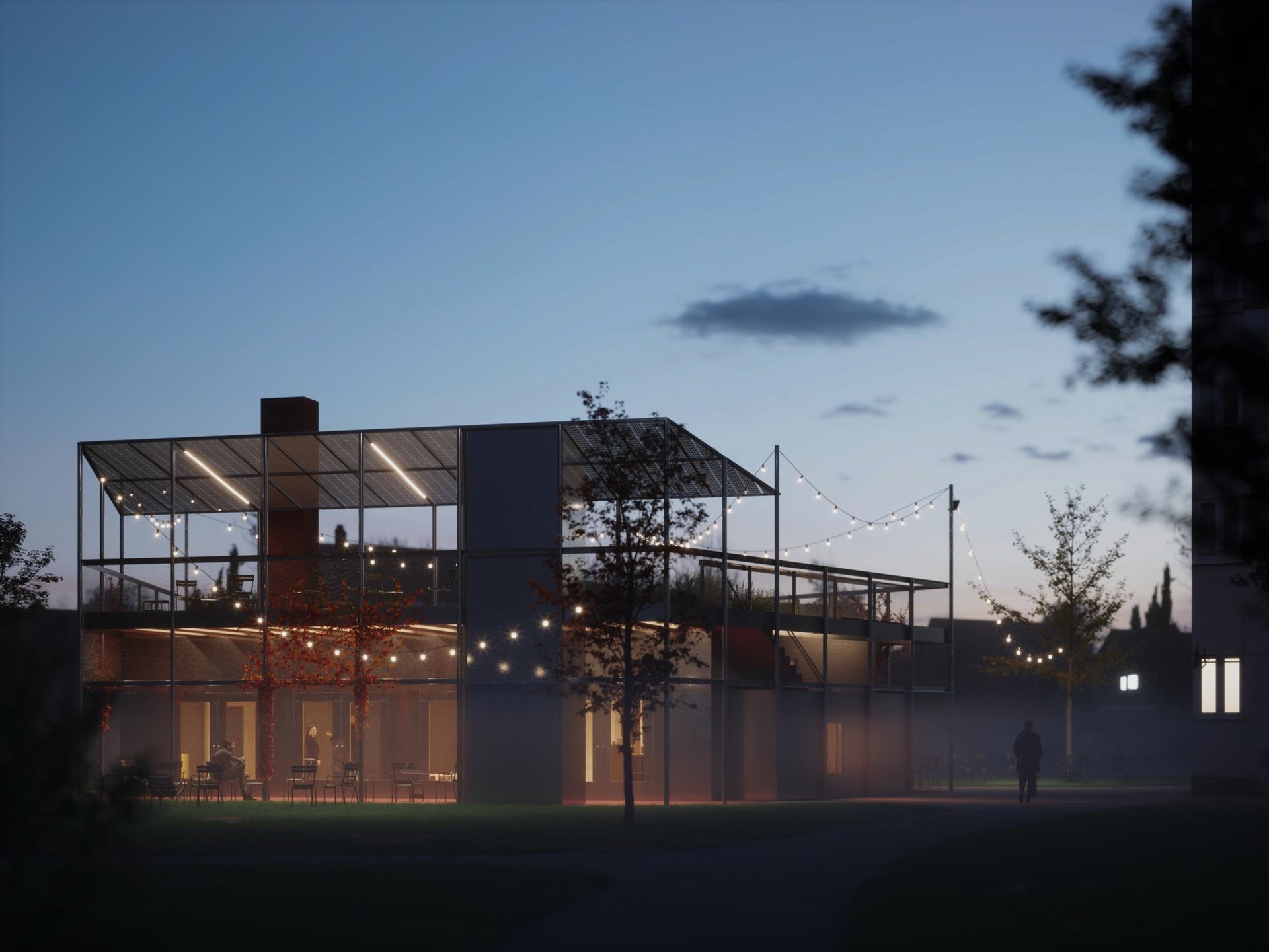 De oppervlakte die we “afnamen” van het park, geven we nu dubbel terug: op het gelijkvloers het buurthuis en erboven een educatieve daktuin. Het nieuwe buurtcentrum verhoudt zich zo doende op twee manieren tot zijn omgeving: een compacte begane grond dat het maaiveld activeert, terwijl op het dak de gebruikers visueel verbonden zijn met de omgeving door middel van een stedelijke belvédère.