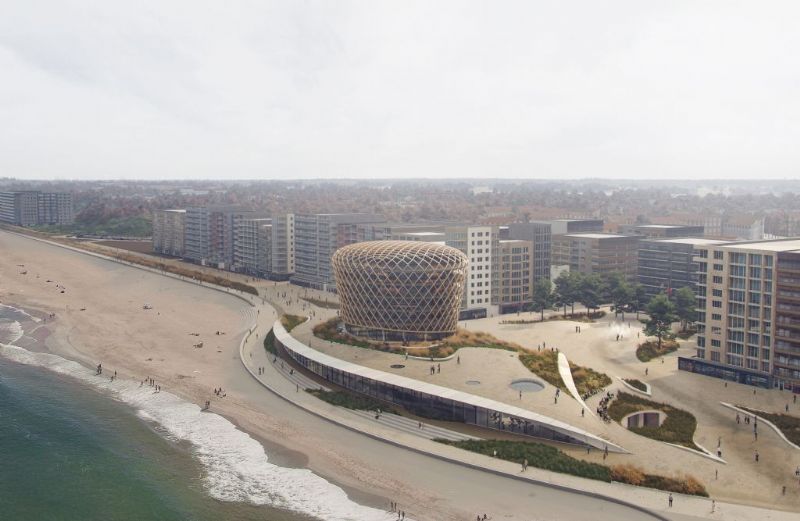 Bovenop het duinlandschap komt dan de opvallende, maar bescheiden ‘skyscraper’: een strandhotel van vier verdiepingen hoog. Het hotel krijgt de vorm van een bolder of meerpaal en verwijst naar vormen en kleuren uit de natuur of de vissershaven.