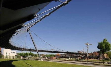 De Collegebrug kadert in de herinrichting van de Leie en haar omgeving in het centrum van de stad. Ze heeft een totale lengte van 203 m en een plan in een S-vorig tracé. Op die manier worden de hellingen van het kunstwerk beperkt tot 5%, een vereiste voor fietsers en voetgangers.De hoofdbalk van deze hangbrug bestaat uit een metalen koker met een constante breedte van 3,2 m en een hoogte van 1 m. De dikte van de staalplaat van de koker varieert tussen 8 en 30 mm. Dwarsverstijvers met een tussenafstand van 2 m verzekeren een goede verbinding tussen de platen. Aan de onderkant zijn de verstijvers zichtbaar en dragen ze bij tot de lichtheid van het kunstwerk. Een gesloten kabel van 90 mm diameter hangt de structuur op aan twee scharnierende masten met variabele doorsnede. Voor de realisatie van de brug was 250 ton staal van staalkwaliteit S355 J2G3 nodig. De beide uiteinden van het kunstwerk zijn ingeklemd in de landhoofden. Het dek van de koker is bedekt met 8 mm polyurethaan met carborundum. Het overige deel van het kunstwerk wordt beschermd door een grijze gemetalliseerde verf, waarvan de kleur evolueert in functie van de oriëntatie van de vlakken, de bezonning en de reflectie van het water. De borstwering is in roestvast staal en bestaat uit een metalen net dat over twee ronde staven gespannen wordt. De keuze voor staal werd mee ingegeven door de lichtheid van de structuur en de grote flexibiliteit in de uitwerking van details.