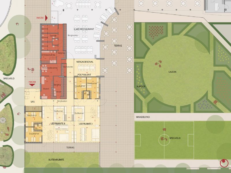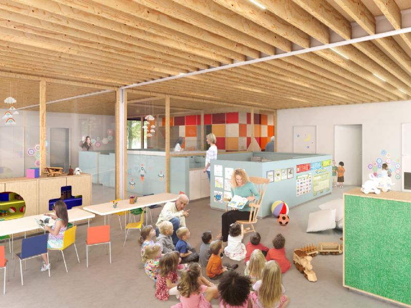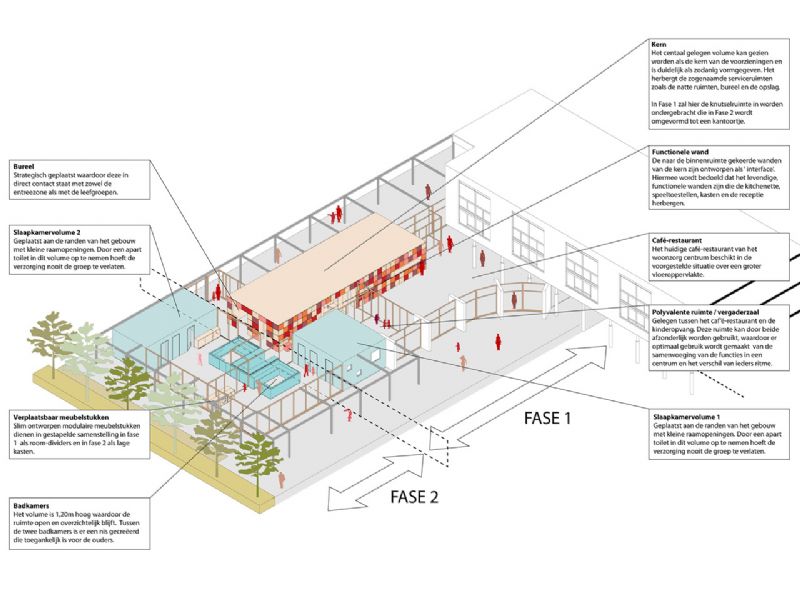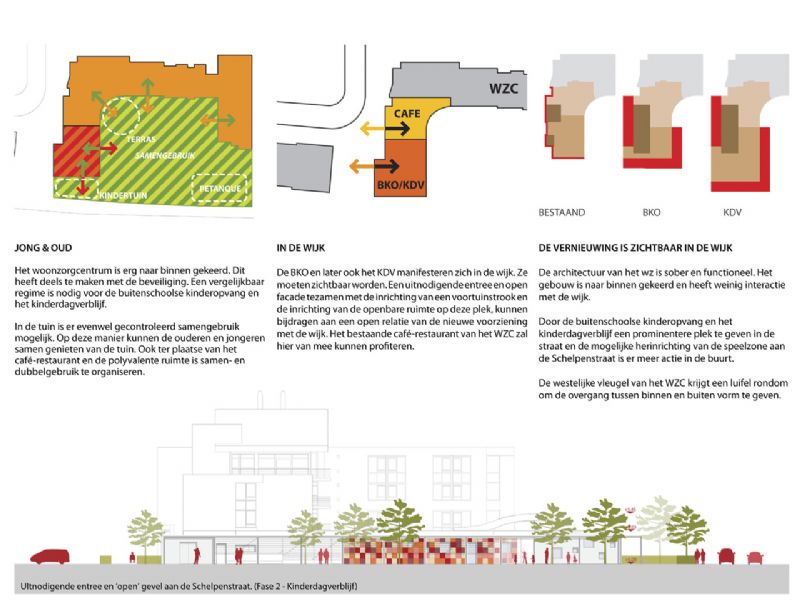Het project in Oostende legt een open verbinding tussen het bestaande woonzorgcentrum en de omliggende woonwijk. De ruimte van het dagverzorgingscentrum in het woonzorgcentrum A. Lacourt komt in de loop van 2014 vrij. Een buitenschoolse kinderopvang neemt in eerste fase een plekje in het bestaande casco in. Een kinderdagverblijf komt er later in de tweede fase bij. Hiervoor is er echter een gedeelte nieuwbouw nodig.