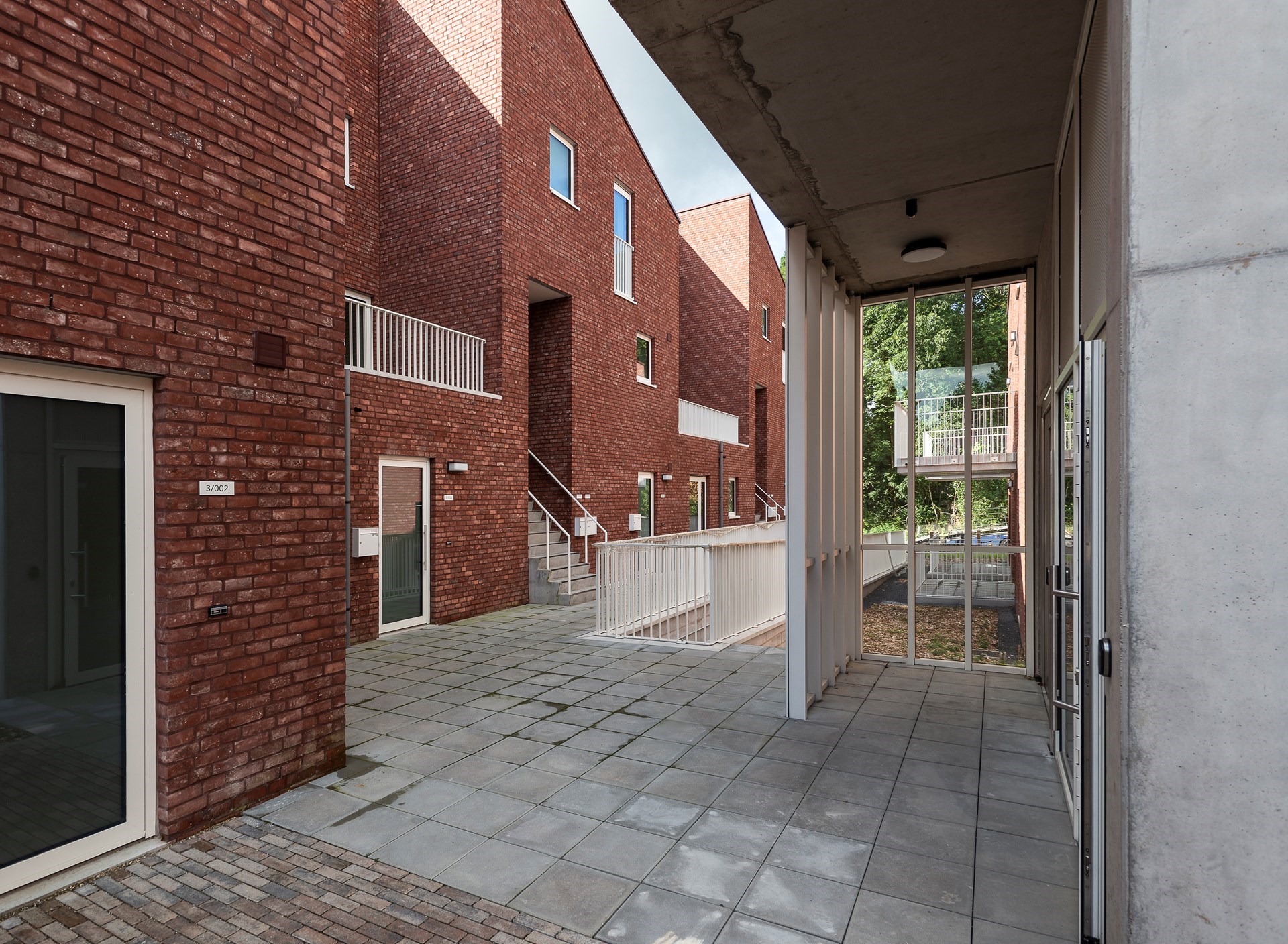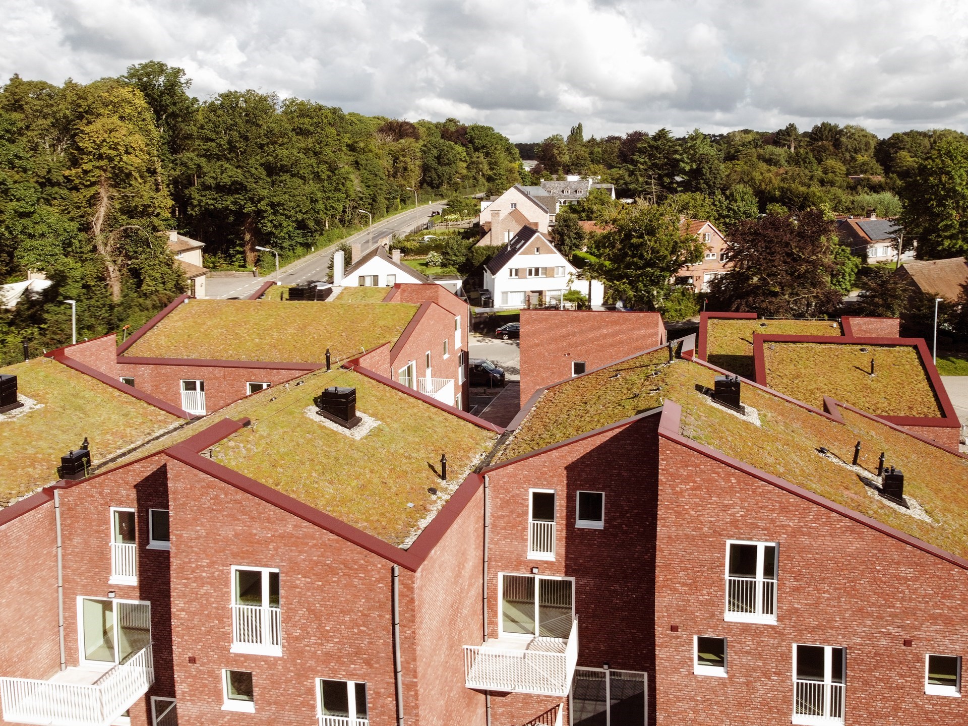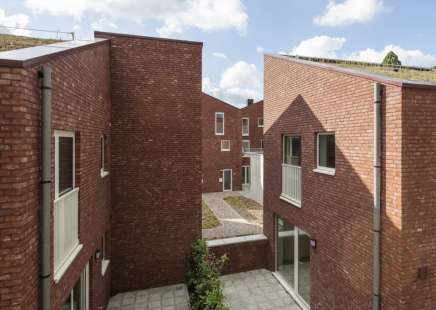 Op een steenworp van het centrum van Waasmunster realiseerde De Volkswoningen drie vervlochten volumes die plaats bieden aan sociale appartementen en individuele woningen voor verhuur. De volumes zijn georganiseerd rond een groen binnenplein. Paden, passerelles en buitentrappen verbinden de wooneenheden, animeren de nieuwe buitenruimte en bevorderen de sociale cohesie.