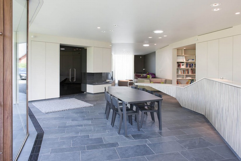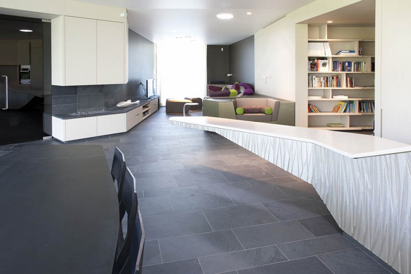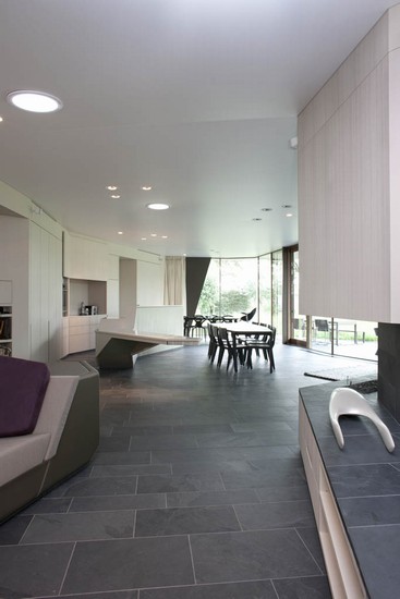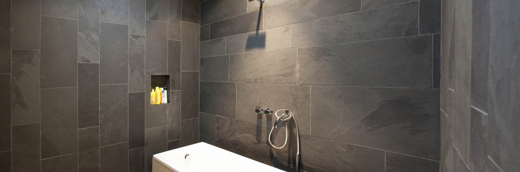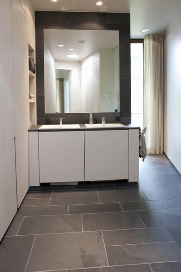 Woning + kantoor: living, keuken en badkamers uitgewerkt met natuursteen. Braziliaanse leisteen Black Slate van Beltrami in bandenverband. Keuze materiaal: vooral esthetische keuze: paste perfect bij andere gebruikte materialen qua sfeer en concept. Daarnaast ook bewuste keuze naar eenvoudig onderhoud.