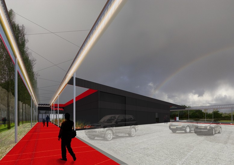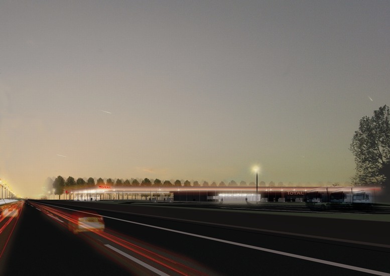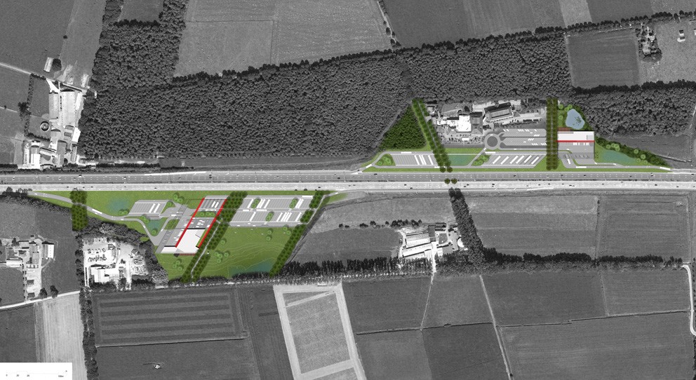 De omgevingsaanleg van de dienstenzones in Nazareth herstelt de structurerende elementen van het omgevende traditionele landschap. Er wordt teruggegrepen naar de kenmerkende dreven en lanen die opvallende landschapskamers vormen in het zandig Schelde-Leie interfluvium. Deze natuurlijke, ruimtelijke geleding creëert een evidente basisorganisatie van de dienstenzones. De robuuste, uitgepuurde gebouwen vleien zich tegen de dominante bomenrijen aan. Een schijnbaar zwevend kader, de superstructuur, reikt tot aan de snelweg. Deze superstructuur vormt een baken en herkenningspunt langsheen de snelweg. De structuur bundelt de traditioneel losstaande elementen van de dienstenzone (parkeer- en tankfaciliteiten, picknickplaatsen, luifel, shop, restaurant, sanitaire inrichting en dienstlokalen), zorgt voor ordening en vergroot de leesbaarheid van de site. De superstructuur omarmt de gebruikers. Heldere rode lopers geflankeerd door de structuur begeleiden bezoekers op veilige wijze naar de verschillende ingangen.